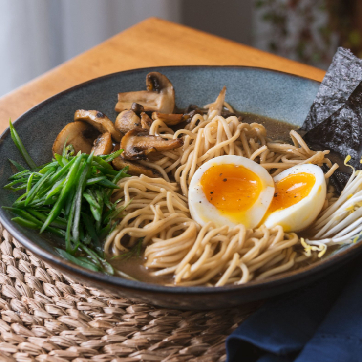 Fideos ramen hechos en un fondo especial acompañado de verduras, alga,huevo