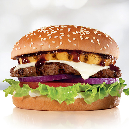 carne de res a la parrilla empanizada, tocino piña asada ,salsa Teriyaki, queso chedar, lechuga, jitomate, cebolla, pepinillos y aderezos (catsup, mayonesa y mostaza)