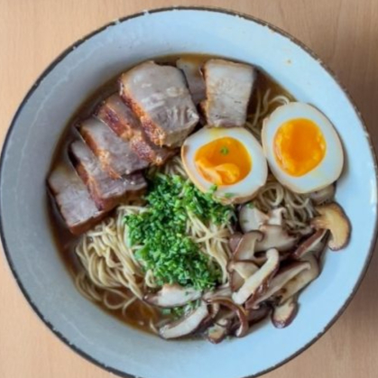 Fideos ramen hechos en un fondo especial acompañado de verduras, alga,huevo y cerdo
