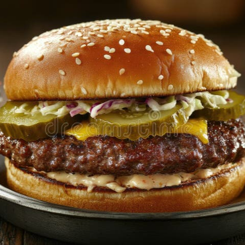 Carne de res a la parrilla y queso chedar lechuga, jitomate, cebolla, pepinillos y aderezos (catsup, mayonesa y mostaza)
