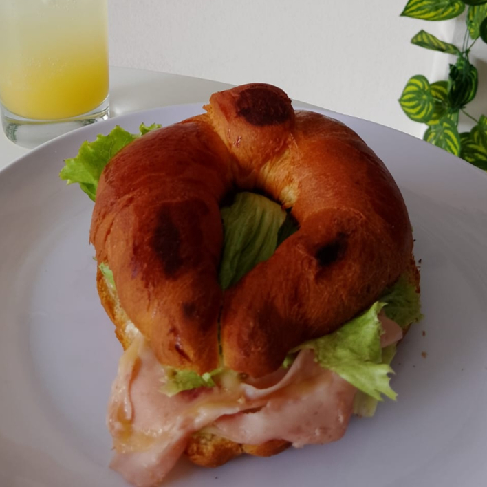 Pan barnizado con huevo relleno de carne de cerdo lechuga, zanahoria y jitomate con 1 huevo y queso