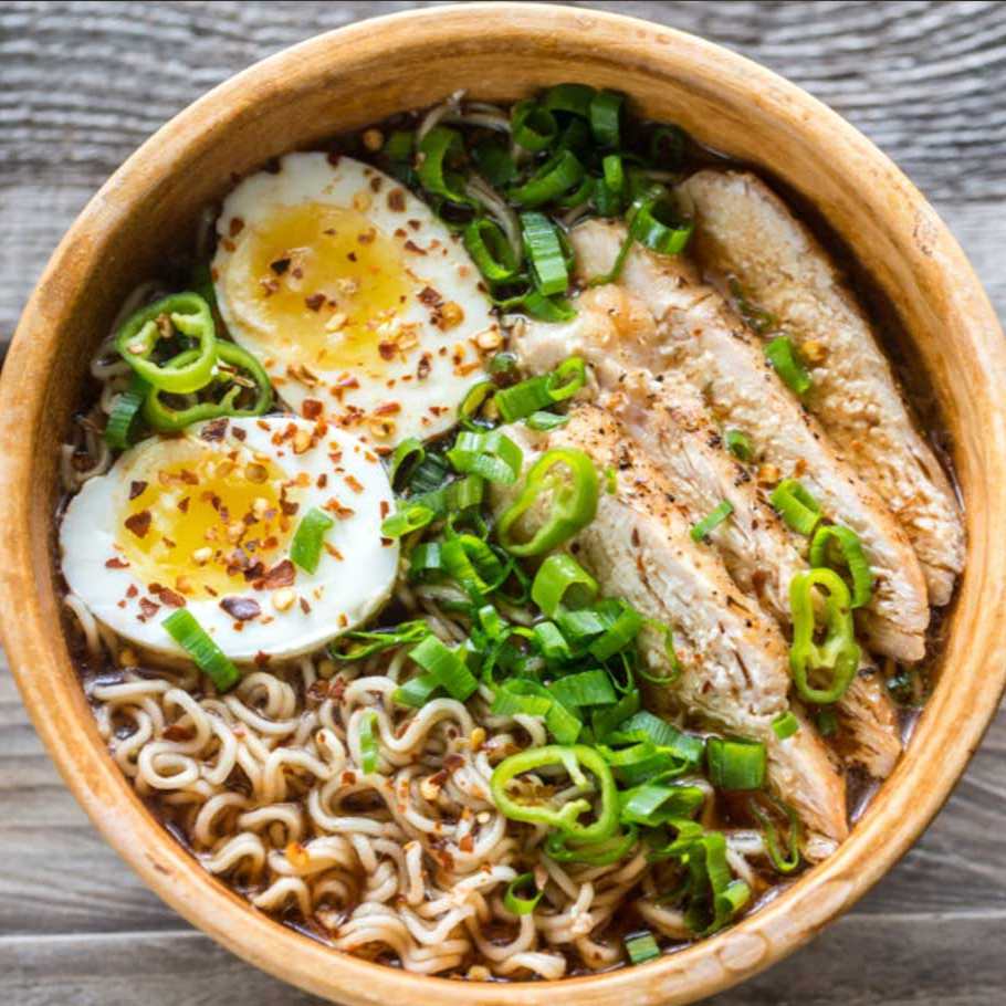 Fideos ramen hechos en un fondo especial acompañado de verduras, alga,huevo y pollo