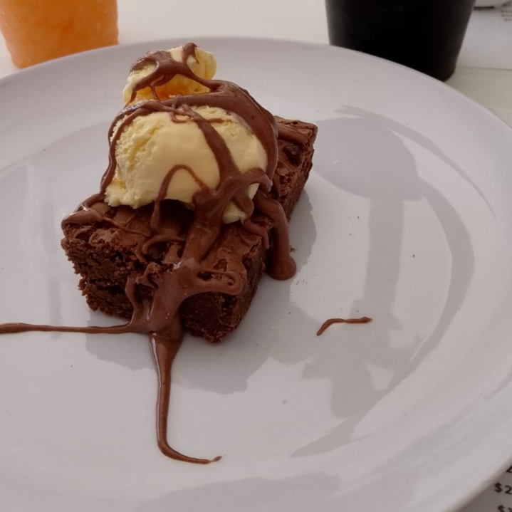 1pz de brownie acompañada con helado de vainilla y bañado en salsa de chocolate