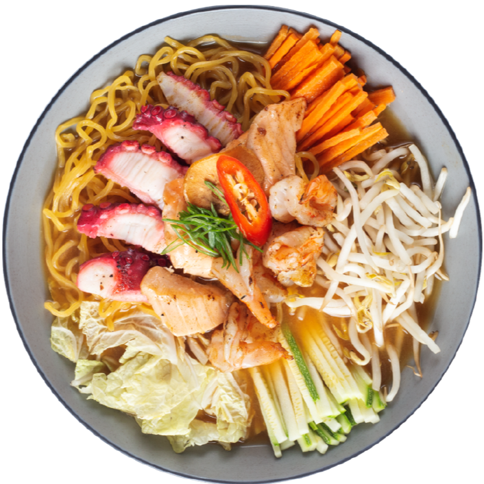 Fideos salteados con verduras, res, camarones y pulpo asados al carbón con nuestra preparación especial