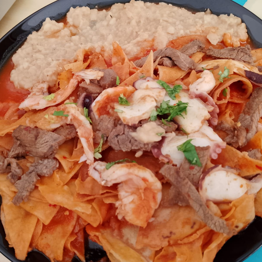 Res y camarones asados, compañados de frijoles , queso gratinado, crema y cilantro