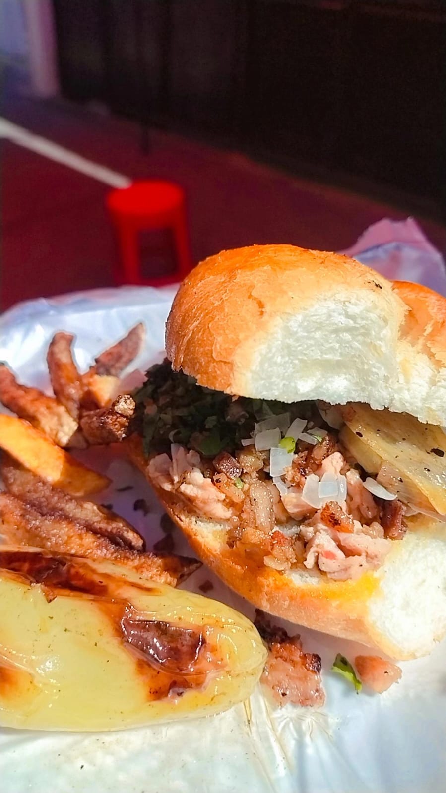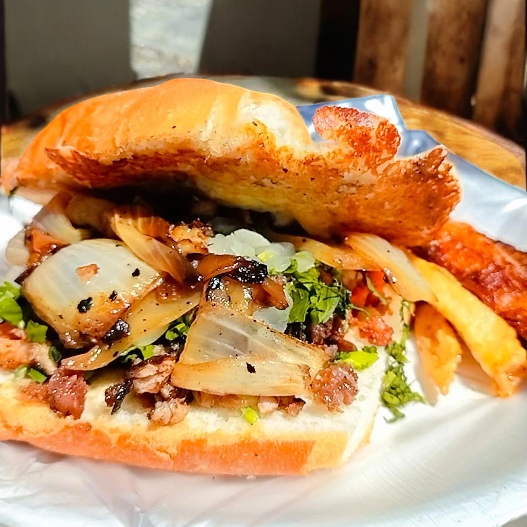Bolillo con queso, carne de tu elección, acompañada de verdura (cilantro y cebolla) y salsa roja casera.