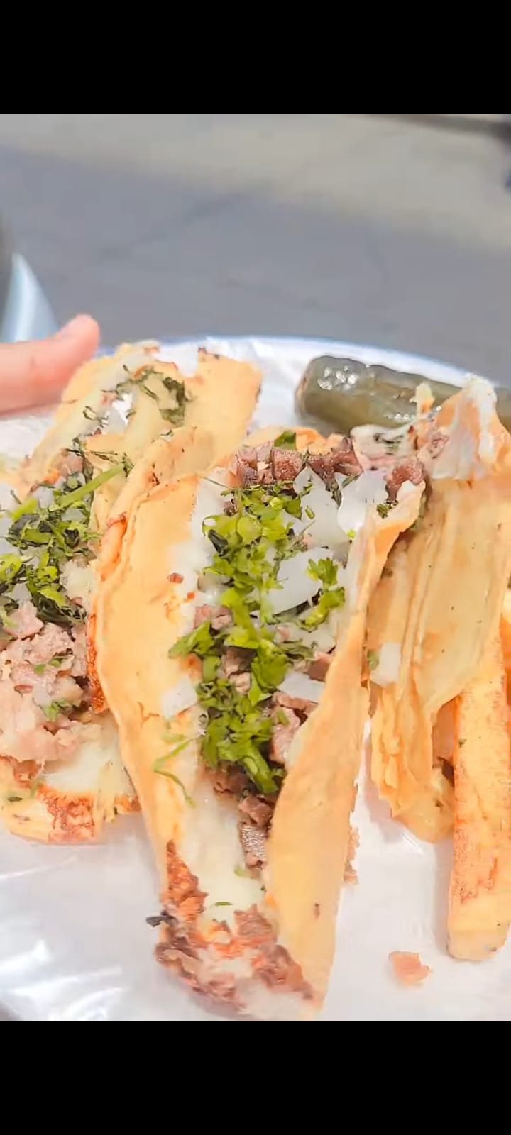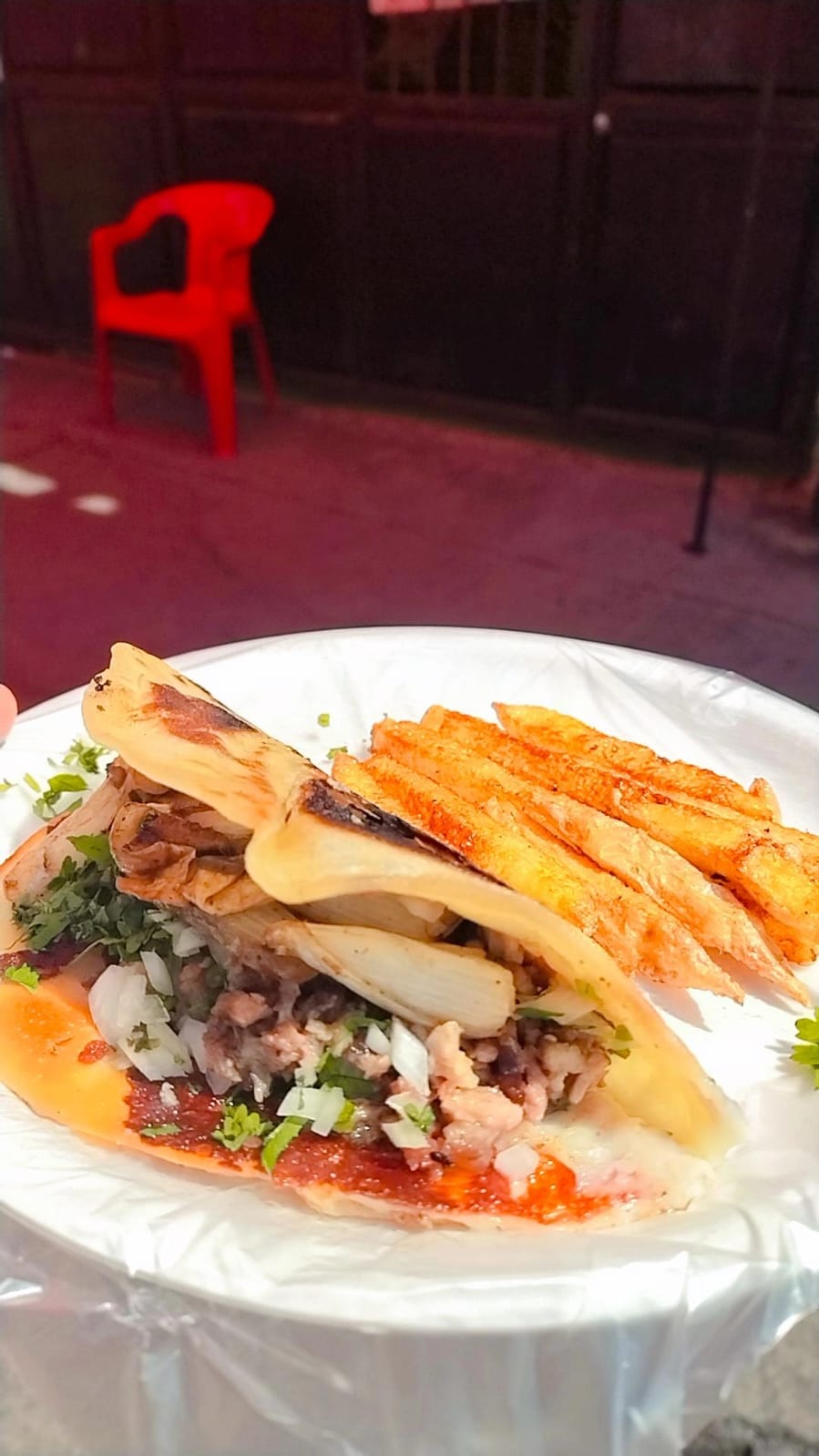 Tortilla con queso dorada, carne de tu elección, acompañada de verdura (cilantro y cebolla) y salsa roja casera.