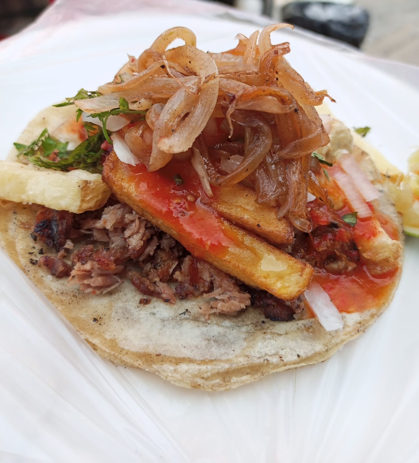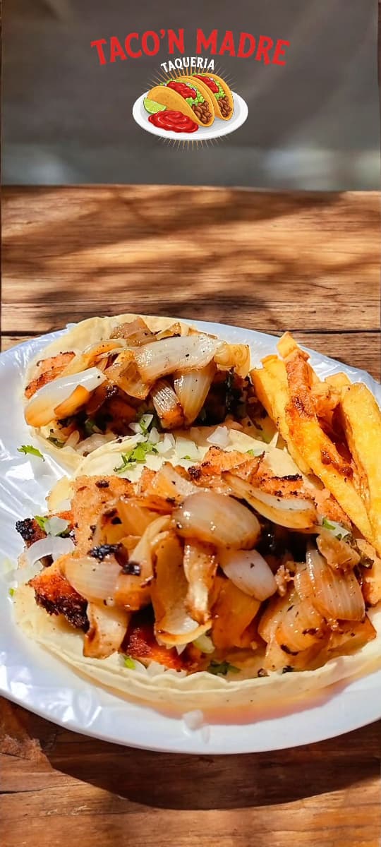 Tortilla con carne de tu elección acompañado de verdura (cilantro y cebolla) y salsa roja casera.