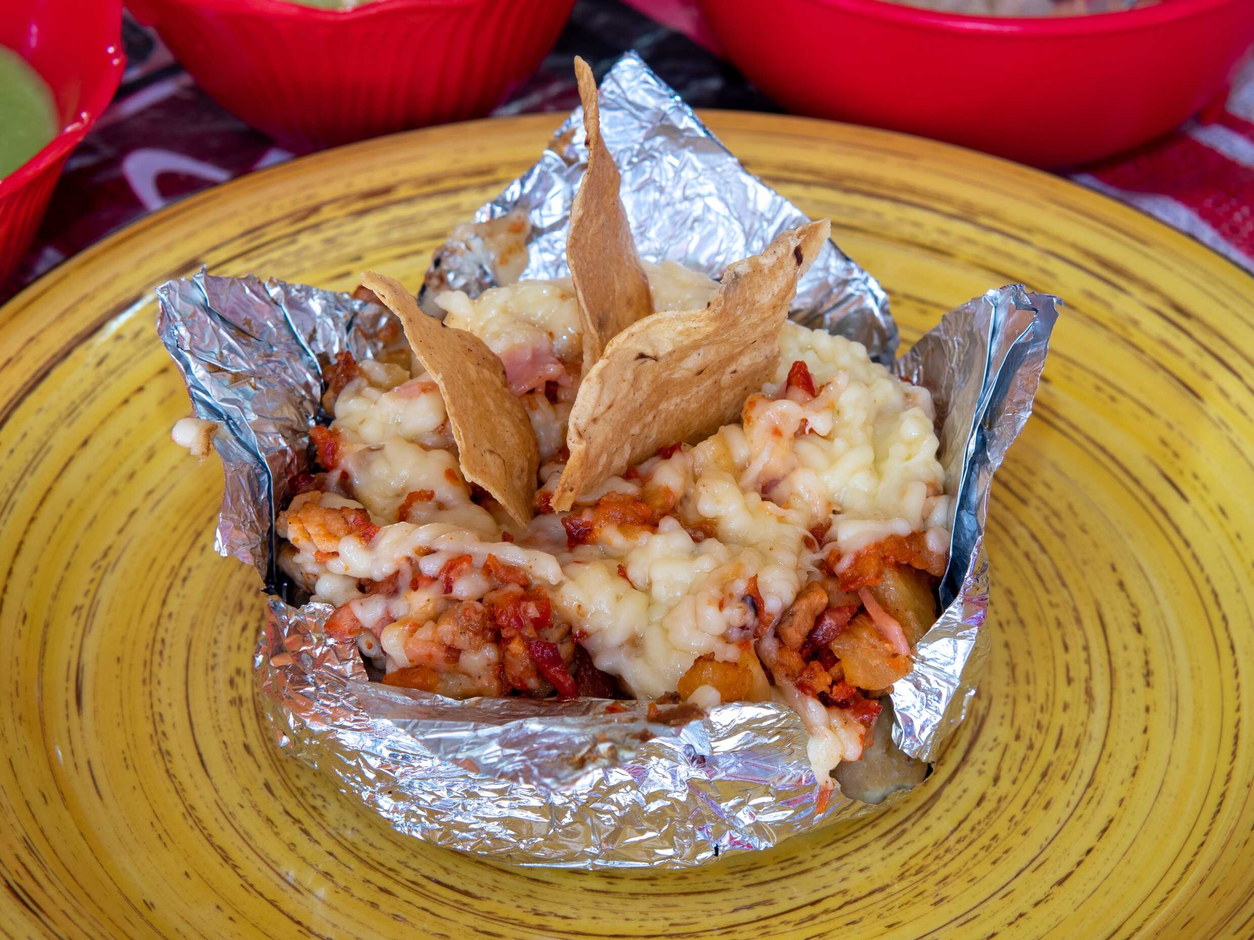 Deliciosa papa asada preparada con mantequilla, chorizo y rico queso fundido