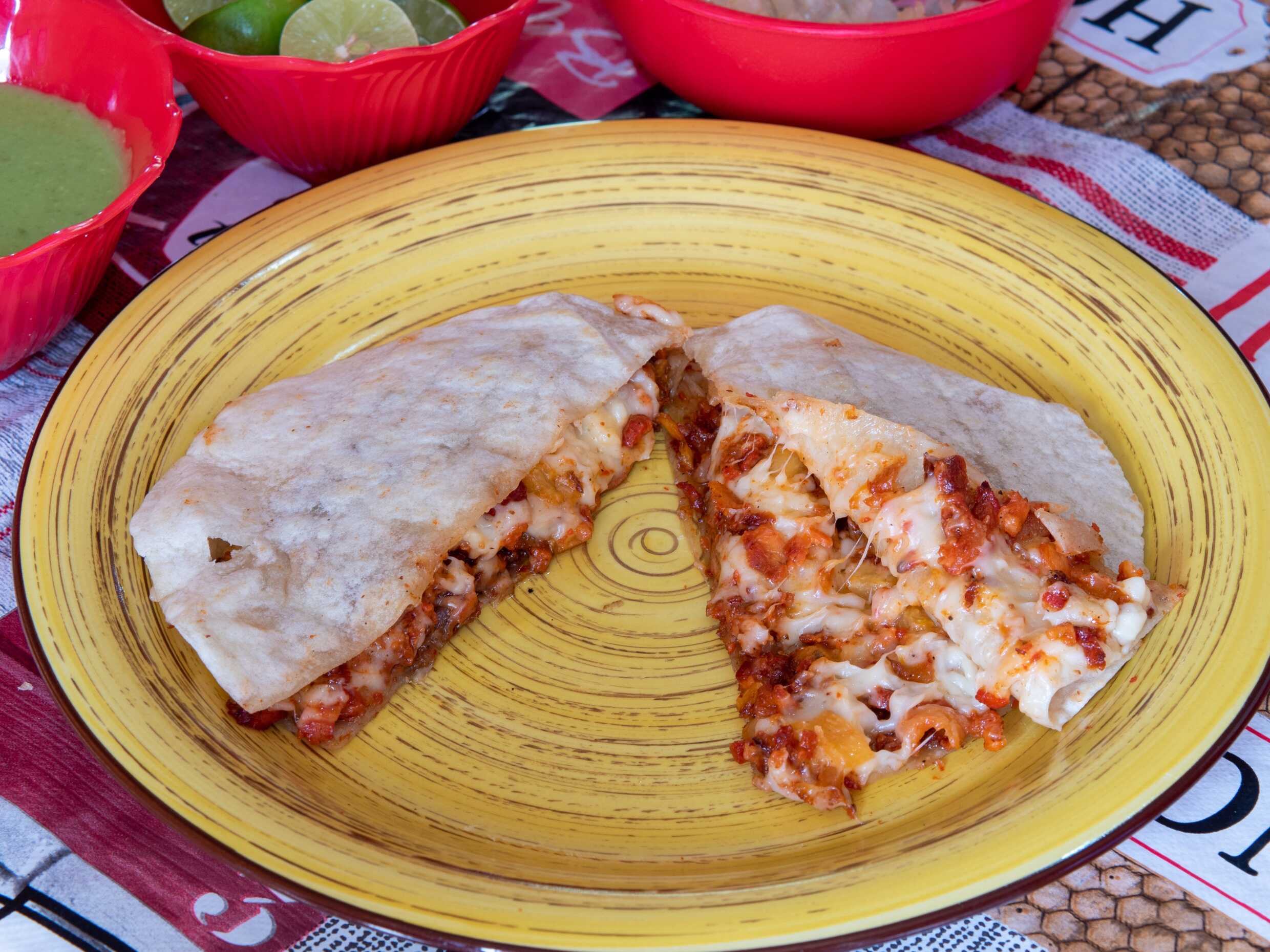 Deliciosa quesadilla preparada con tortillas de maiz, chorizo y rico queso fundido.