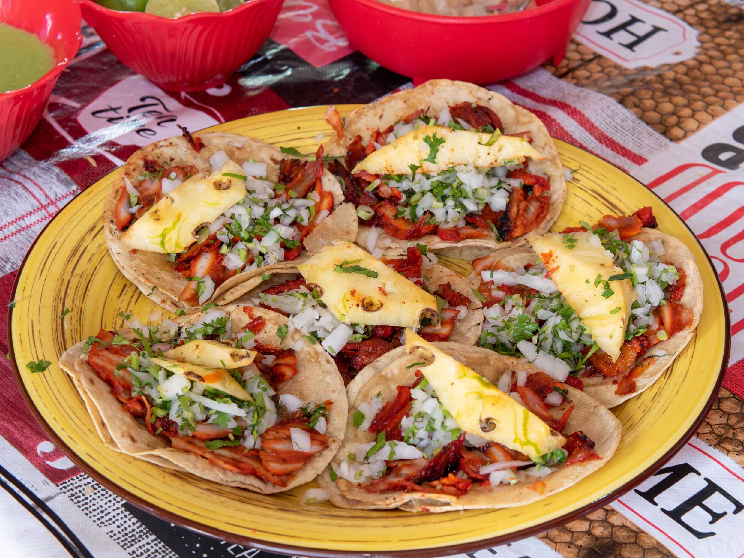 Deliciosos tacos al pastor con piña, cebolla y cilantro.