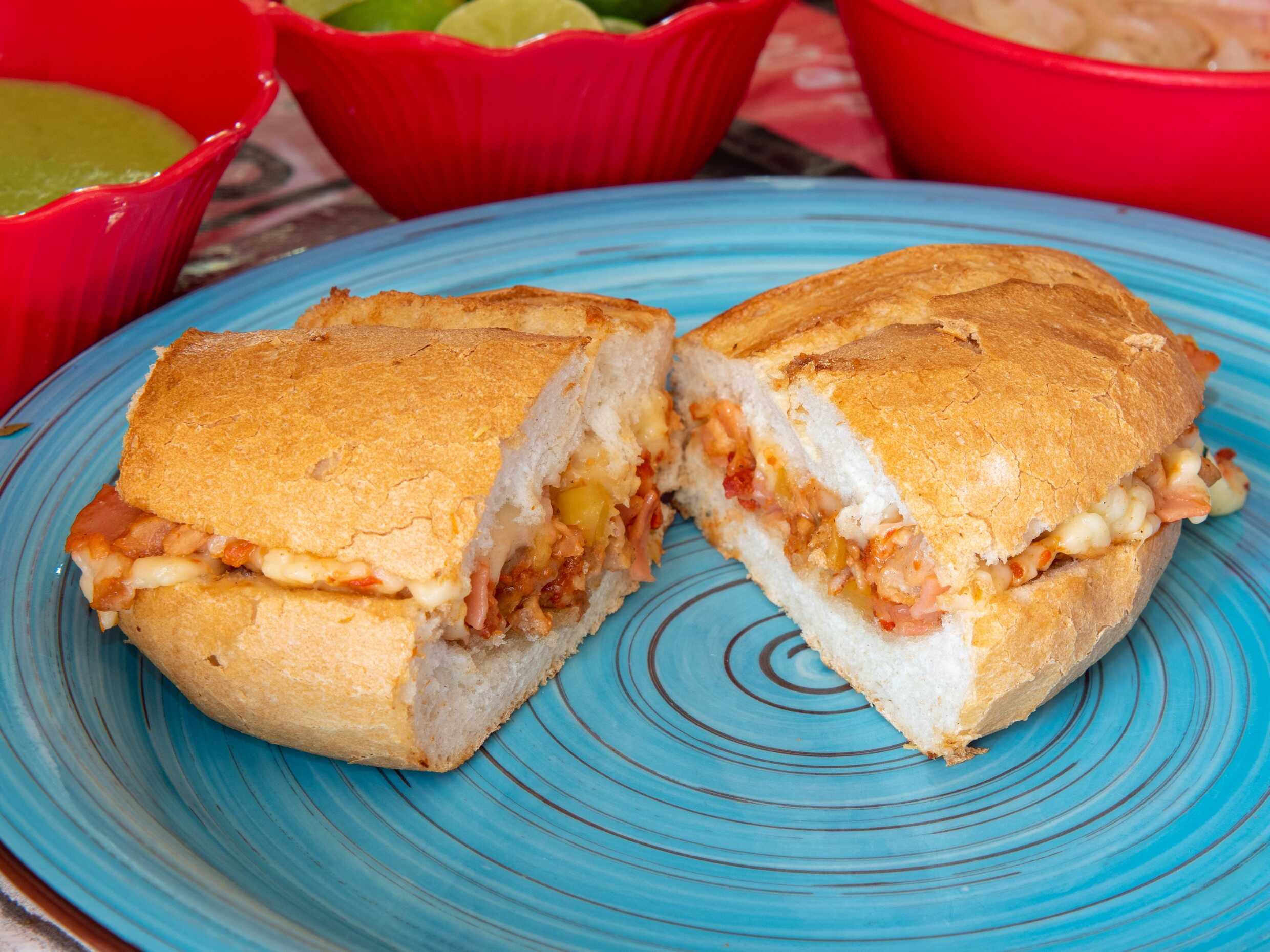 Deliciosa torta preparada con pan fresco, bistec, pastor, jamón y rico queso fundido.