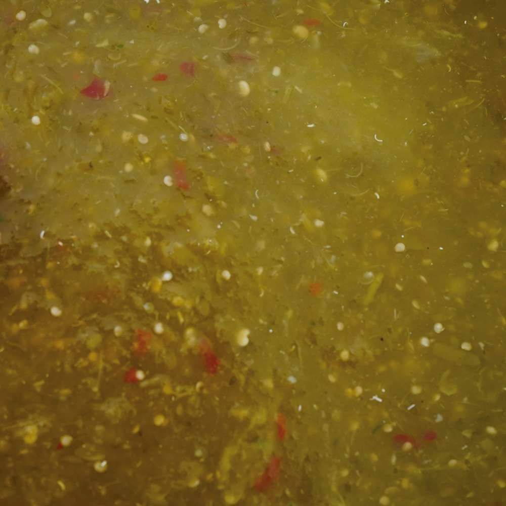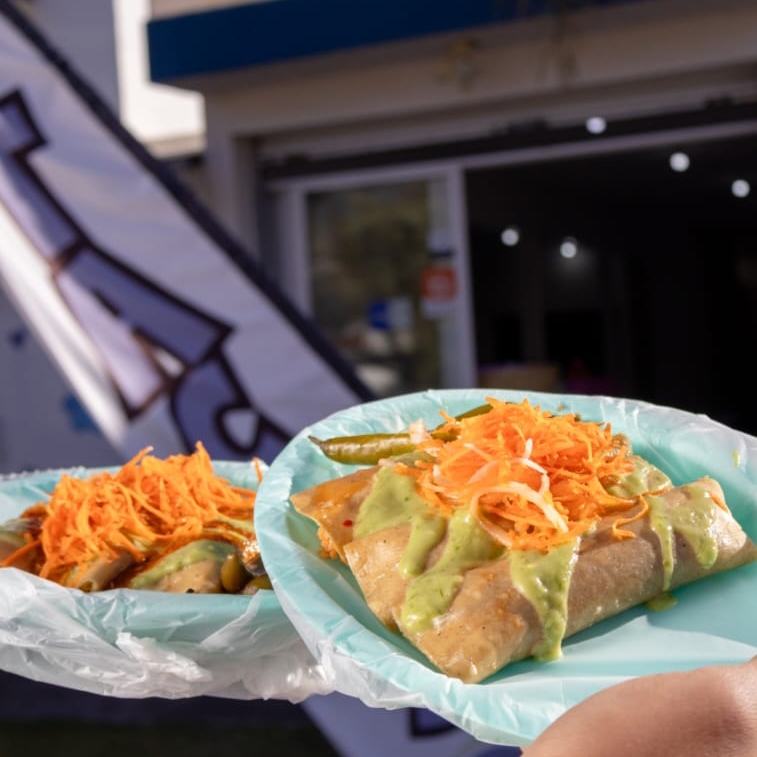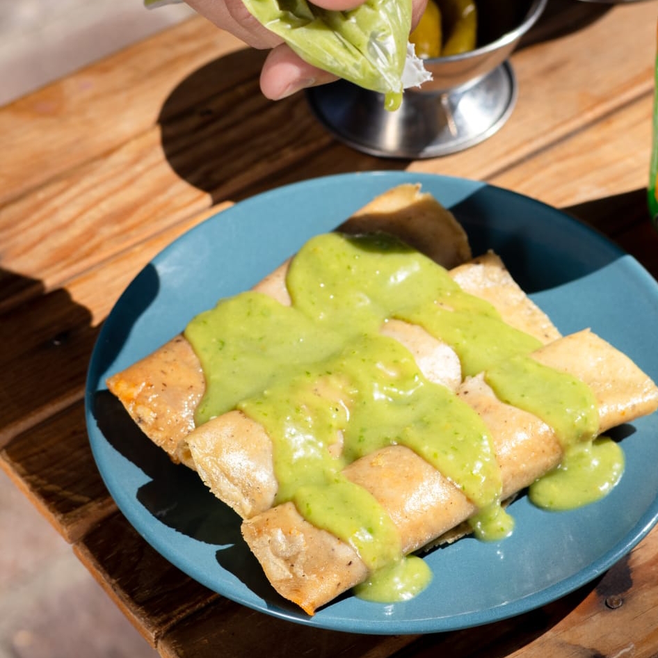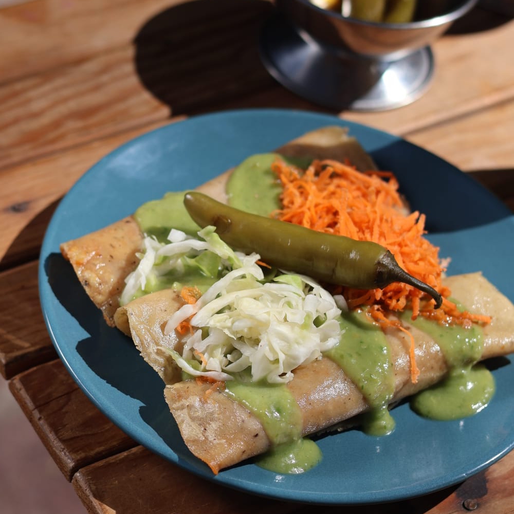 Tortilla de maíz con chicharrón prensado en salsa de chile guajillo.