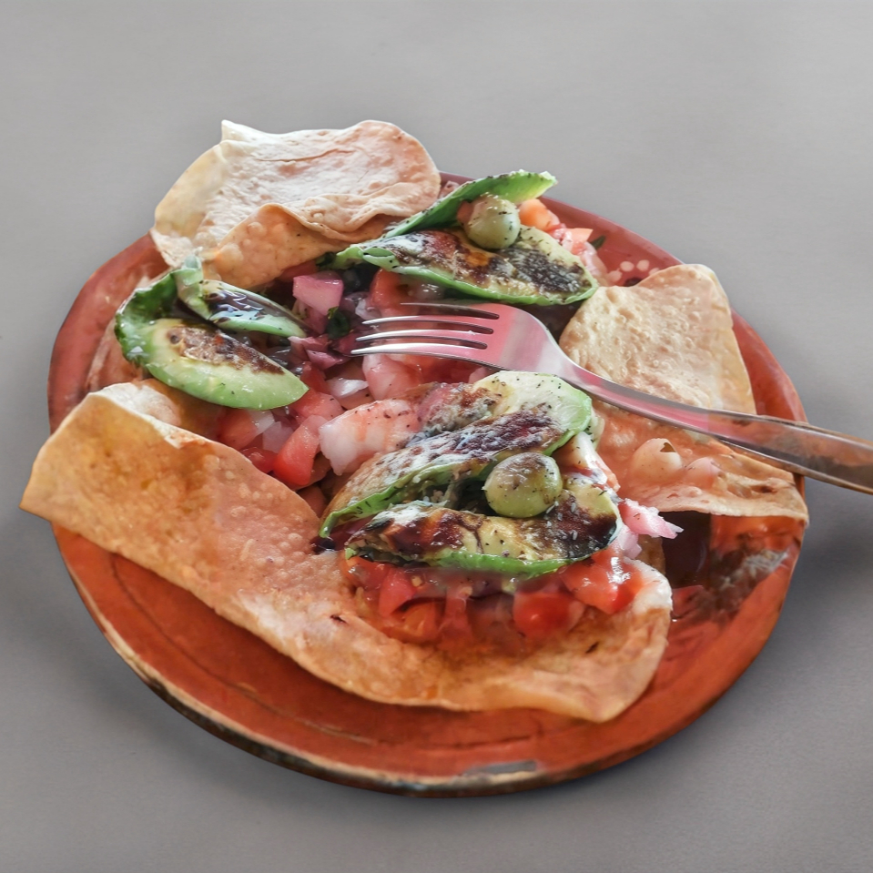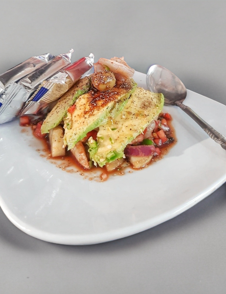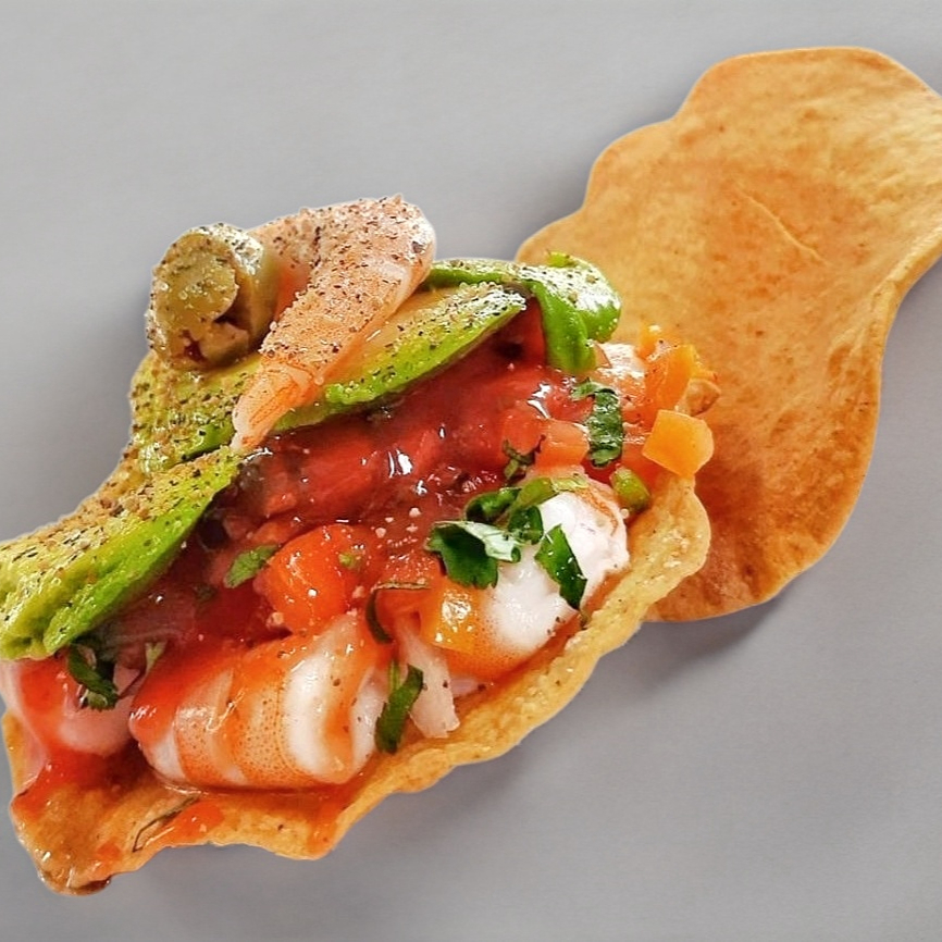 Camarón, jitomate, cebolla, cilantro y aguacate
