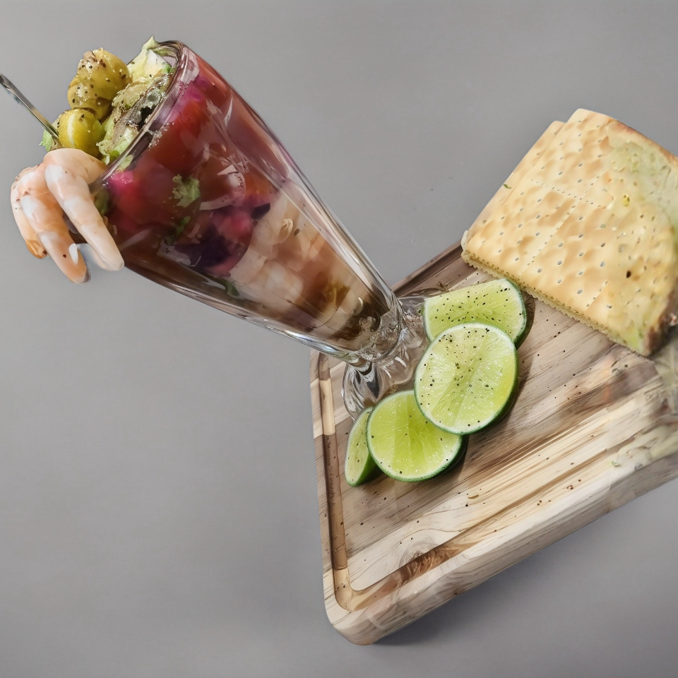 Camarón, Pulpo, Ostión, jitomate, cebolla, limón, cilantro, catsup y aguacate
