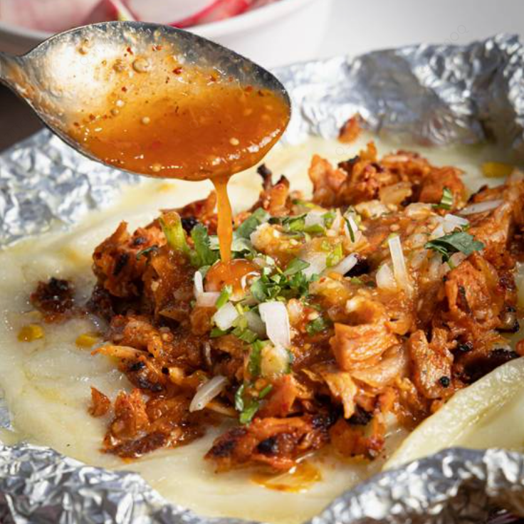 Tortillas de maíz rellenas de carne de cerdo marinada, acompañadas de piña y salsa.