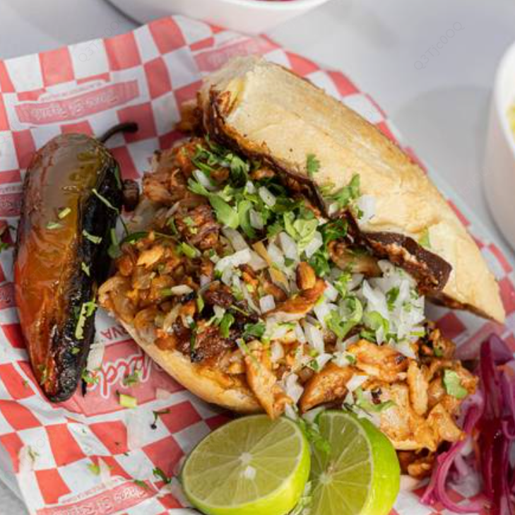 Bocadillos de pan rellenos de chorizo, cebolla, tomate, y guacamole.