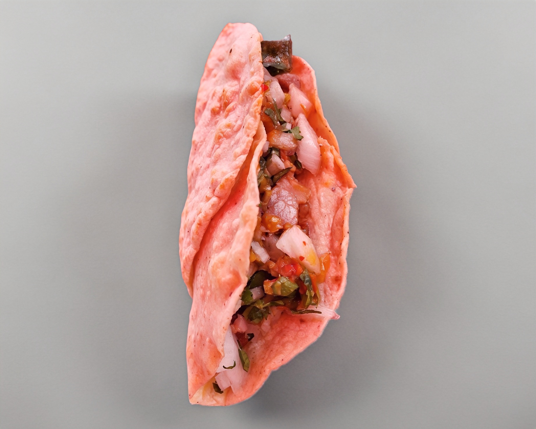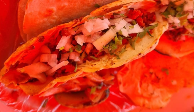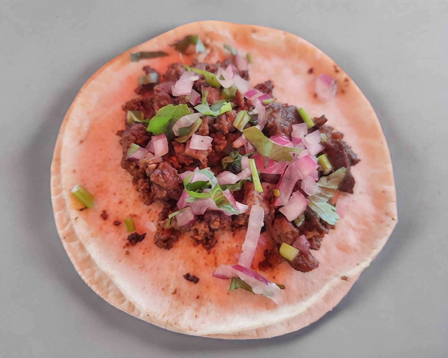 Bistec de cerdo con chorizo, servido en dos tortillas de maíz con queso fundido, cilantro y cebolla.