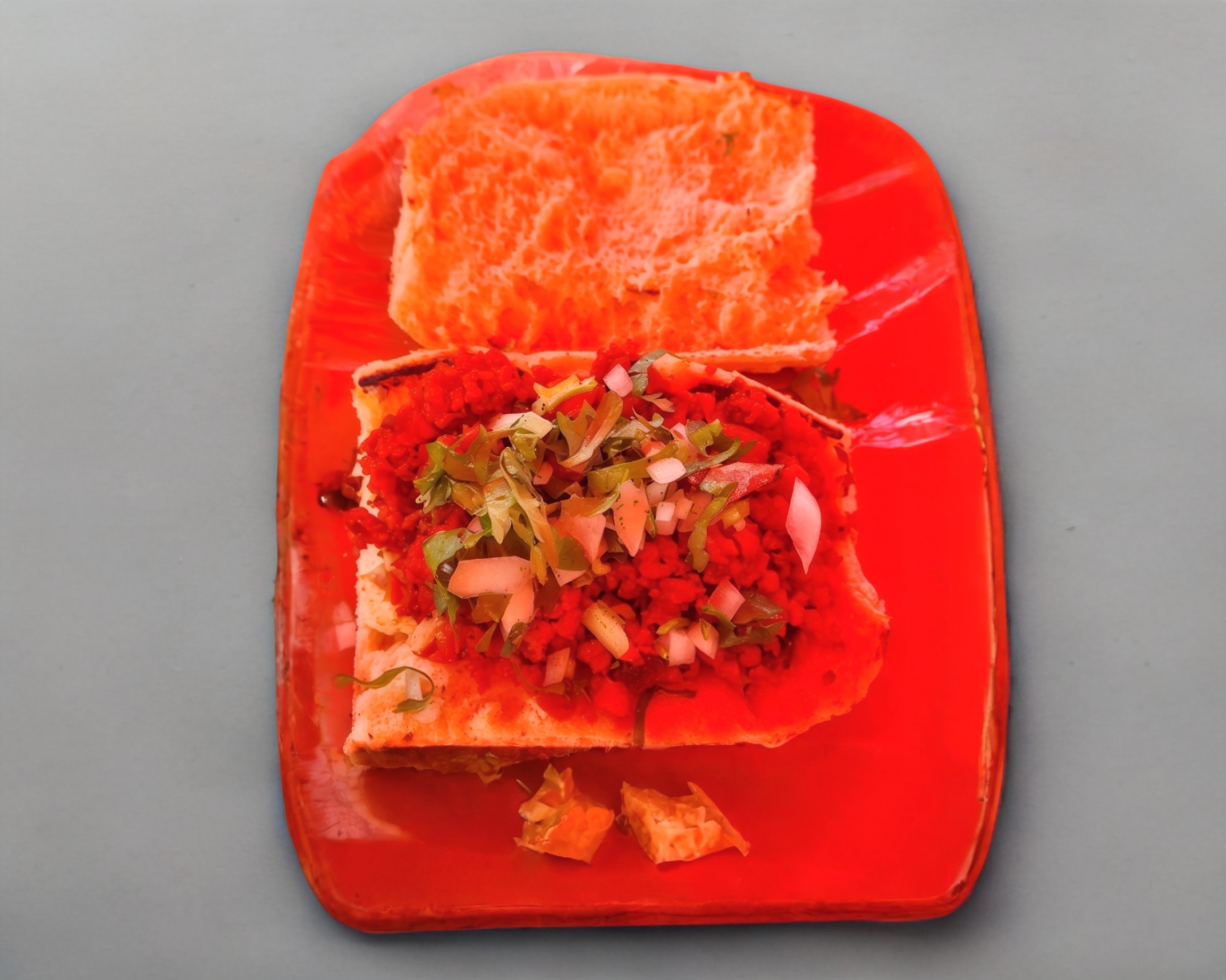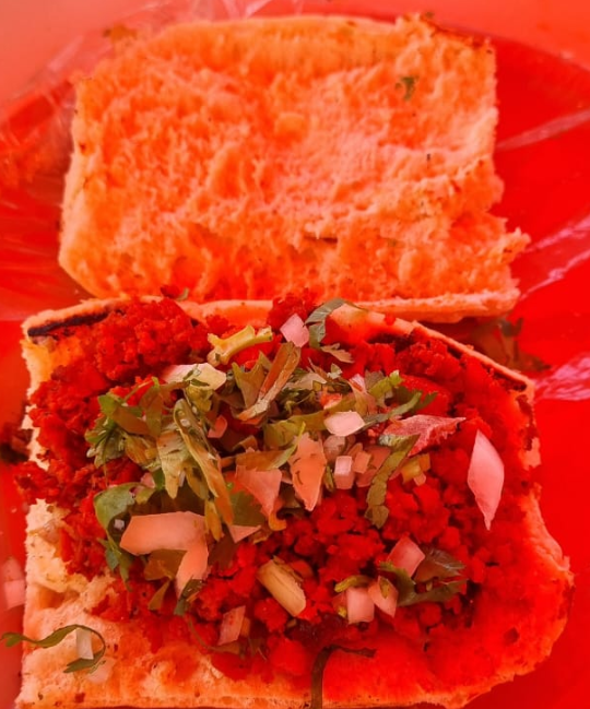 Hígado de res asado, servido en dos tortillas de maíz con queso fundido, cilantro y cebolla.