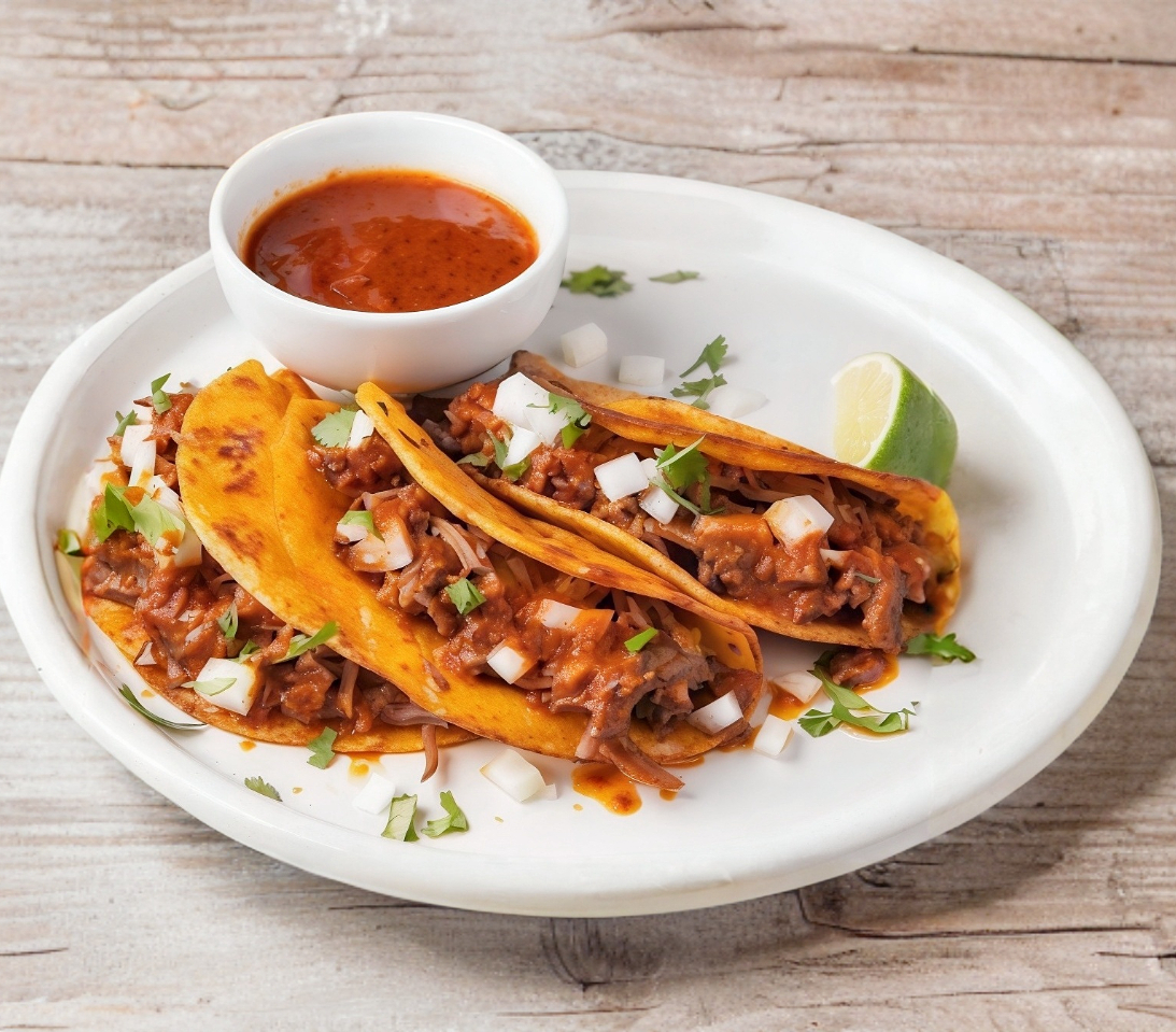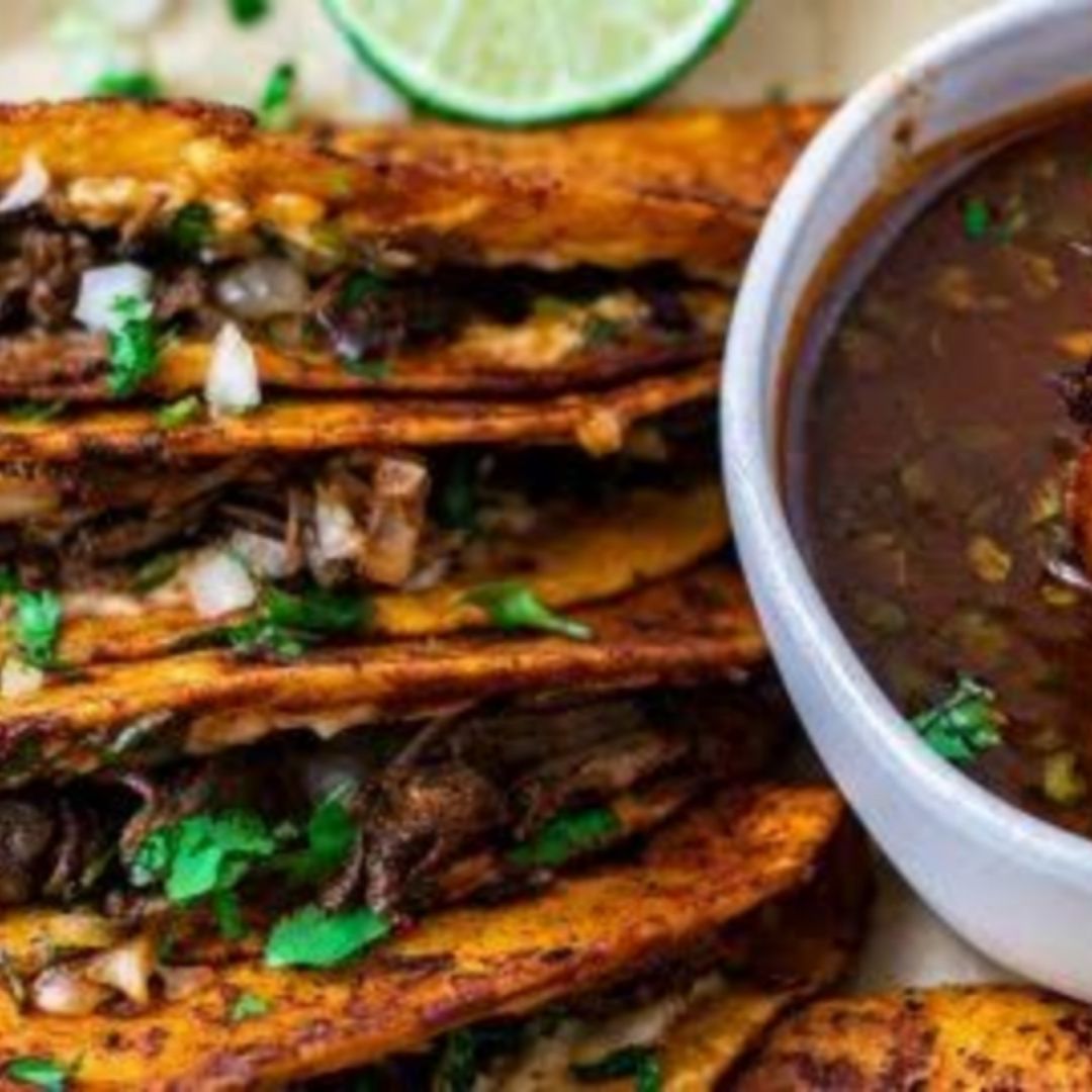 Tortilla de maíz con birria de res y dorada con la grasa de la birria.