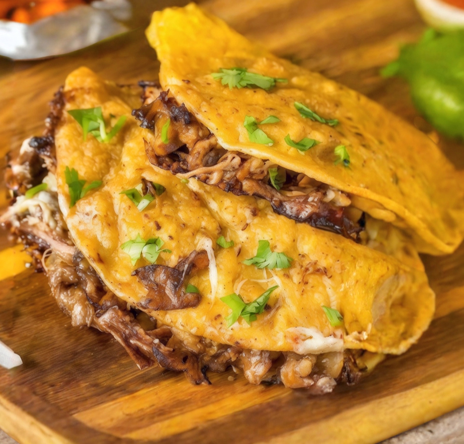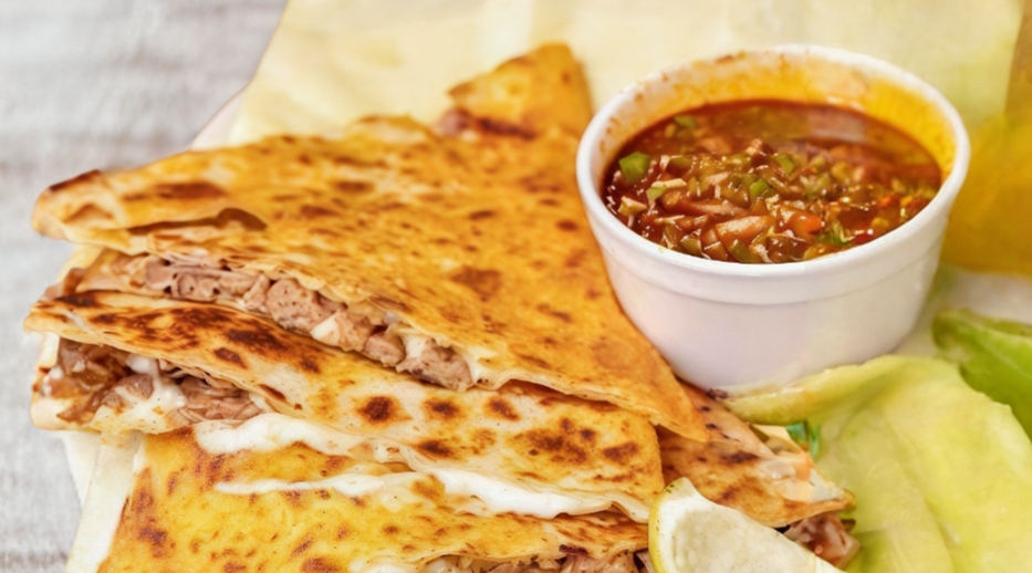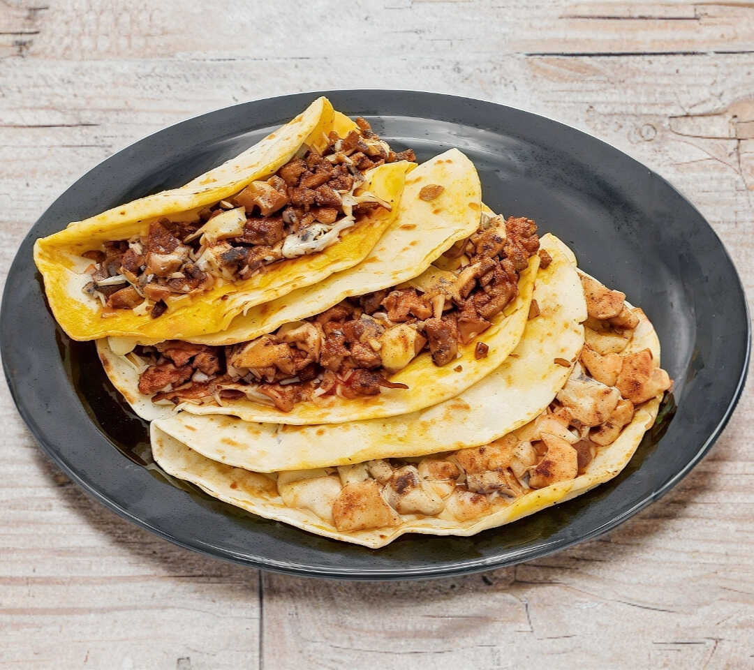 Quesadilla de 4 tortillas de maíz colocadas en línea con la carne de tu elección. Puedes elegir hasta 3 carnes.