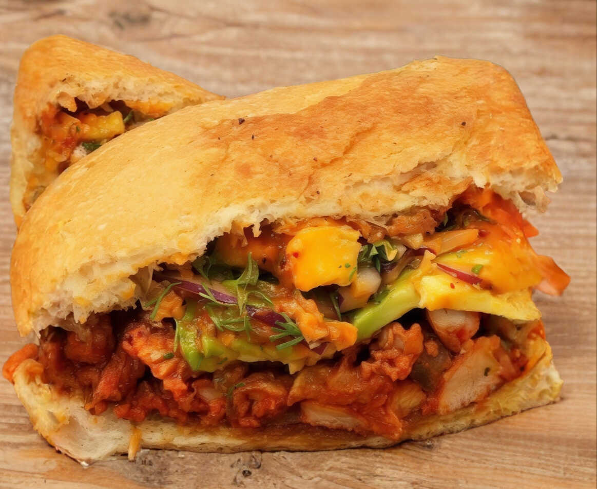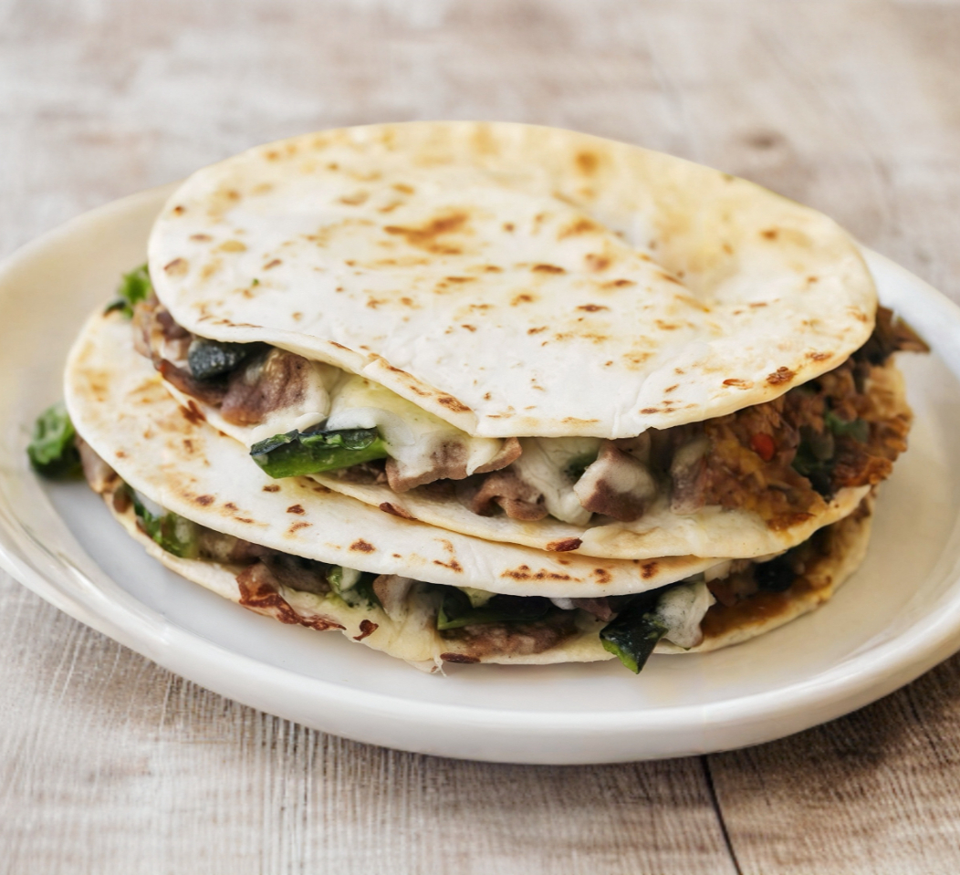 Tortilla de harina con queso derretido, la carne de tu elección y encima otra tortilla de harina.