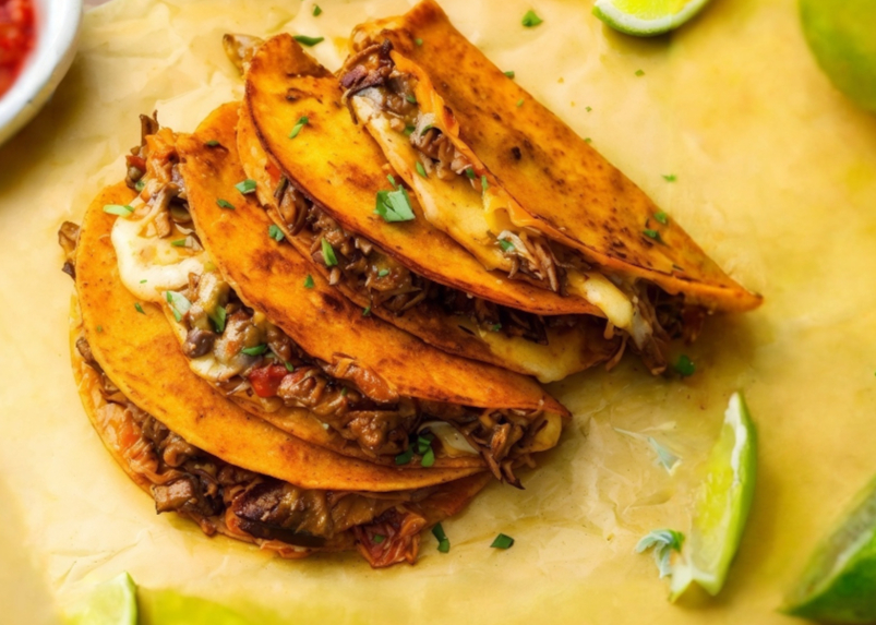 Quesadilla de 4 tortillas de maíz colocadas en línea con birria de res.