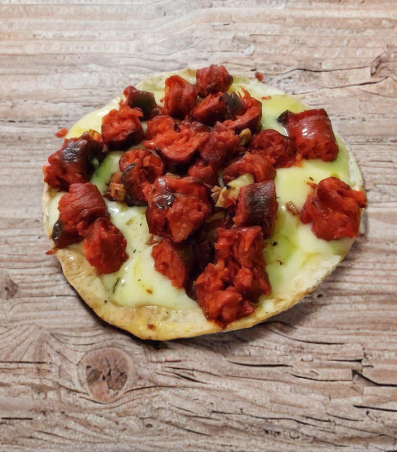 Tortilla de maíz tostada con queso derretido y chorizo.