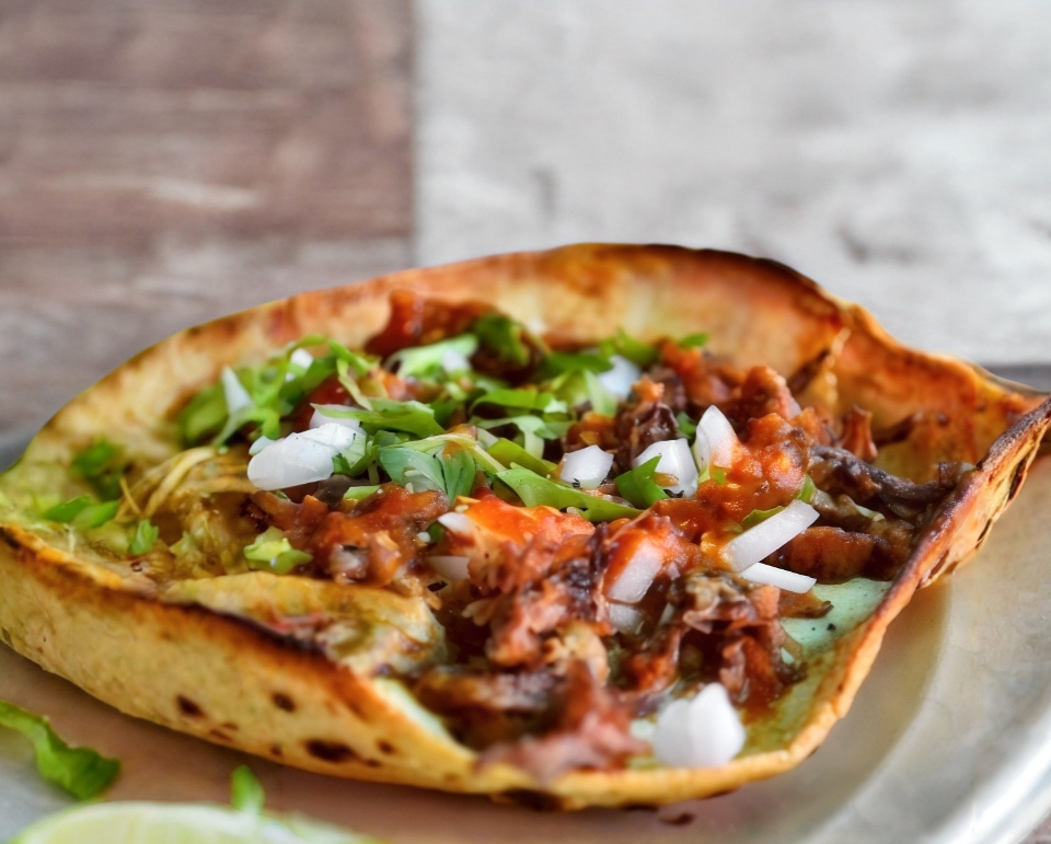 Tortilla de maíz tostada con queso derretido y la carne de tu elección.