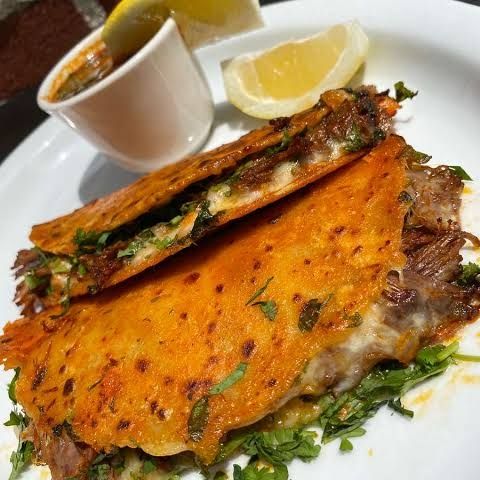 Tortilla de maíz con queso derretido y birria de res y dorada con la grasa de la birria.