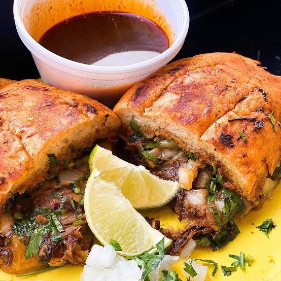 Quesadilla grande de tortilla hecha a mano de harina o de maíz con birria de res.