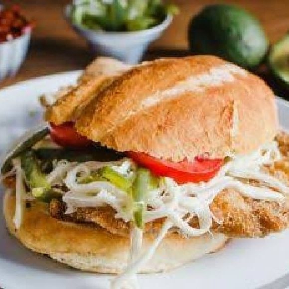 Pan (bolillo) con filete de pescado capeado.