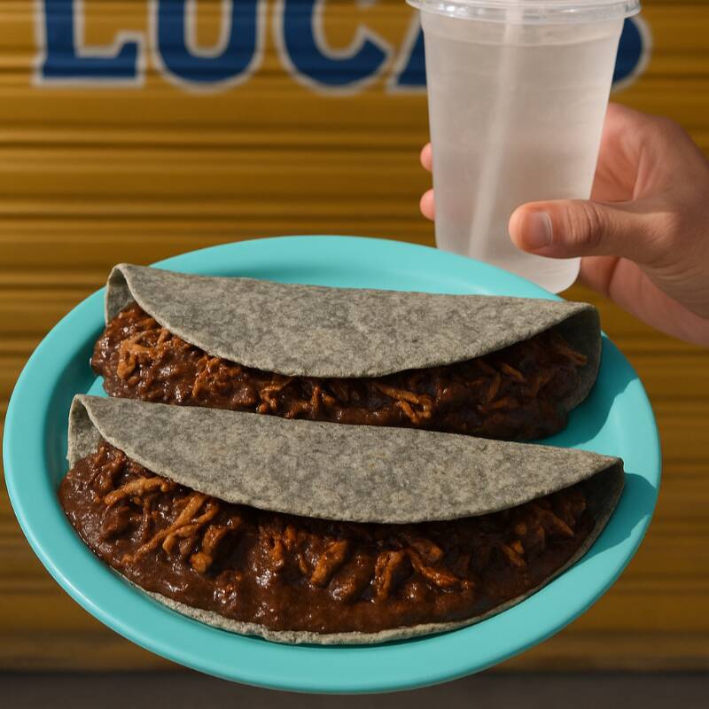 2 Deliciosas Quesadillas de Mole acompañadas de un vaso con agua de sabor del día de 500ml