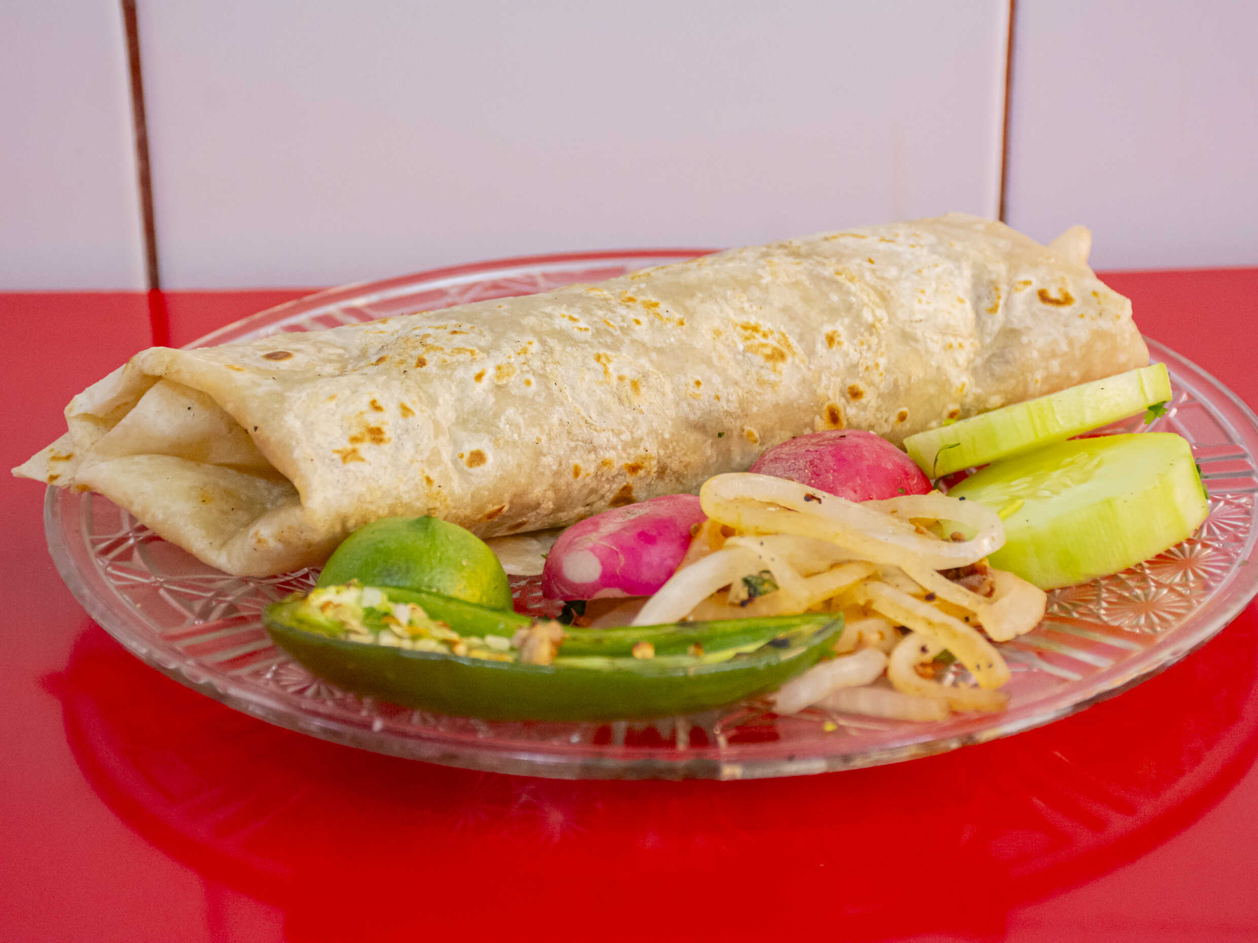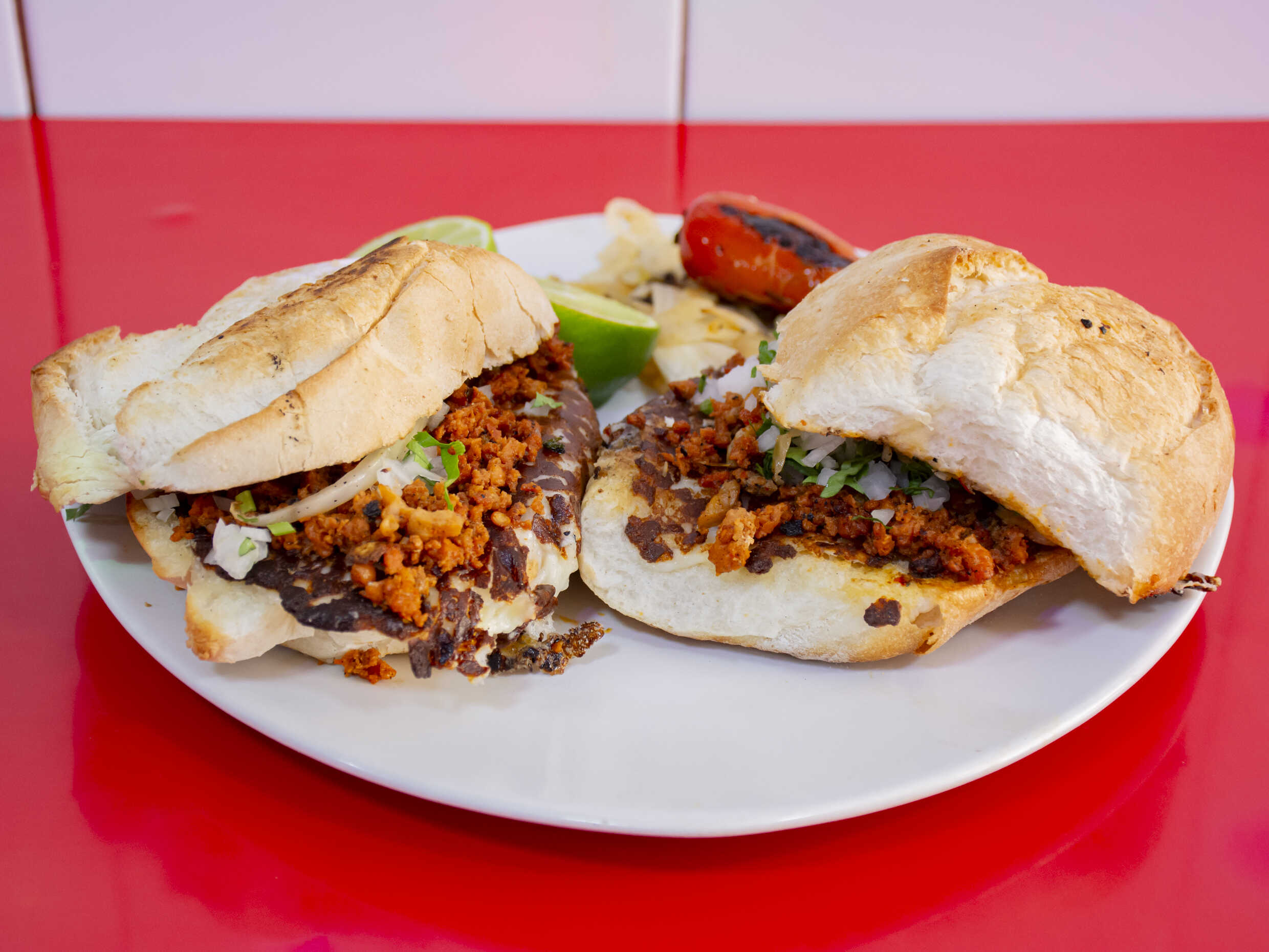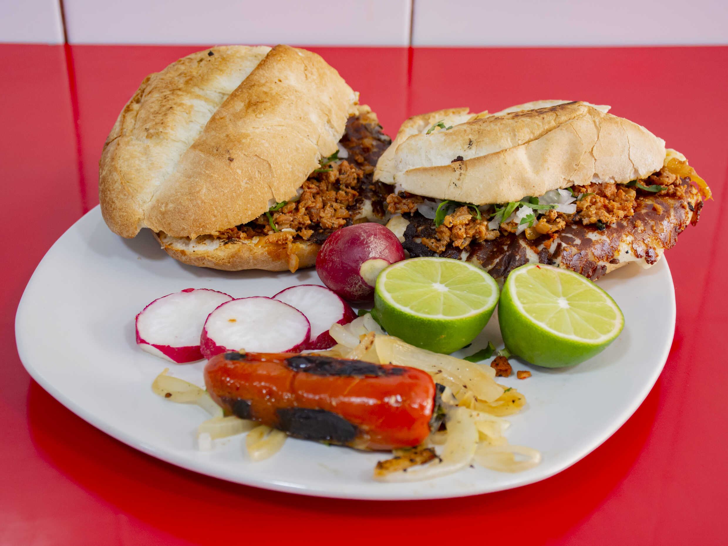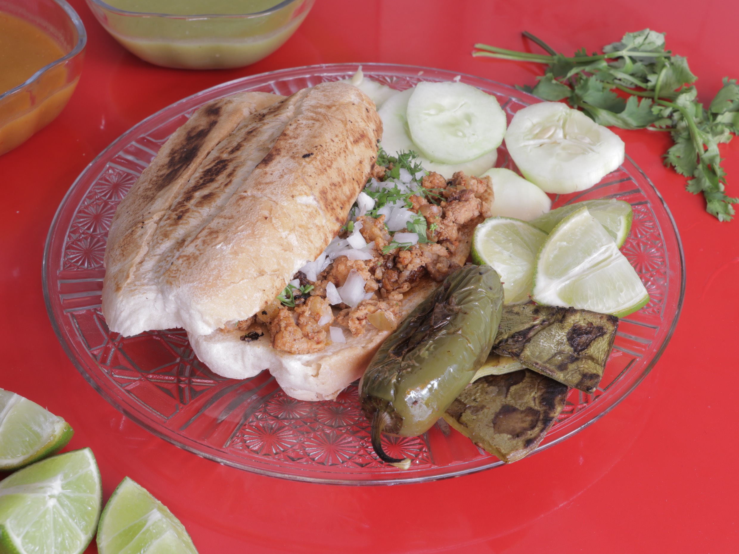 2 tortas de pastor, las cuales incluyen : pastor 3 cucharadas soperas, chorizo, bistec de res, costilla de res, limones, pepino, cilantro, cebolla, Chile y salsa roja