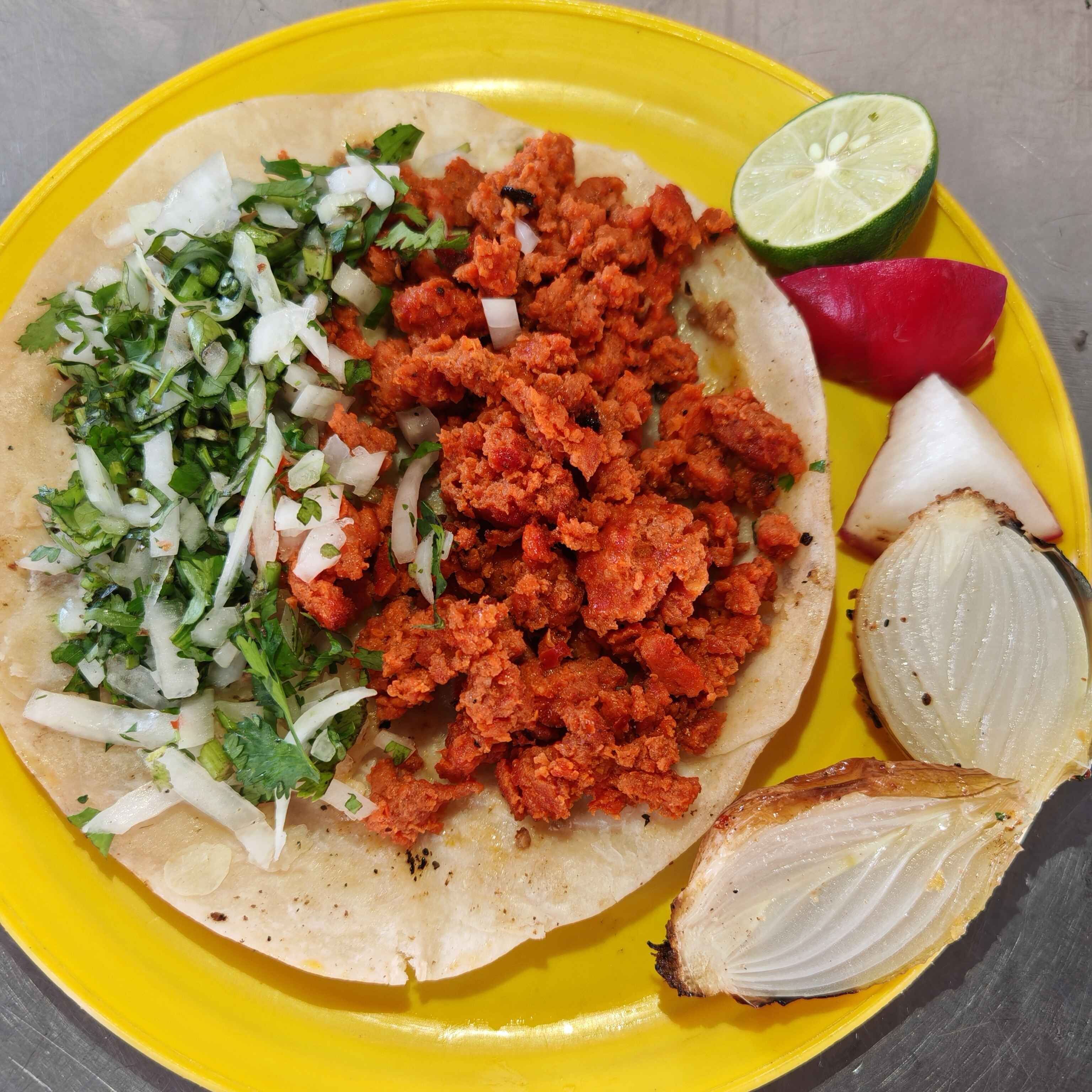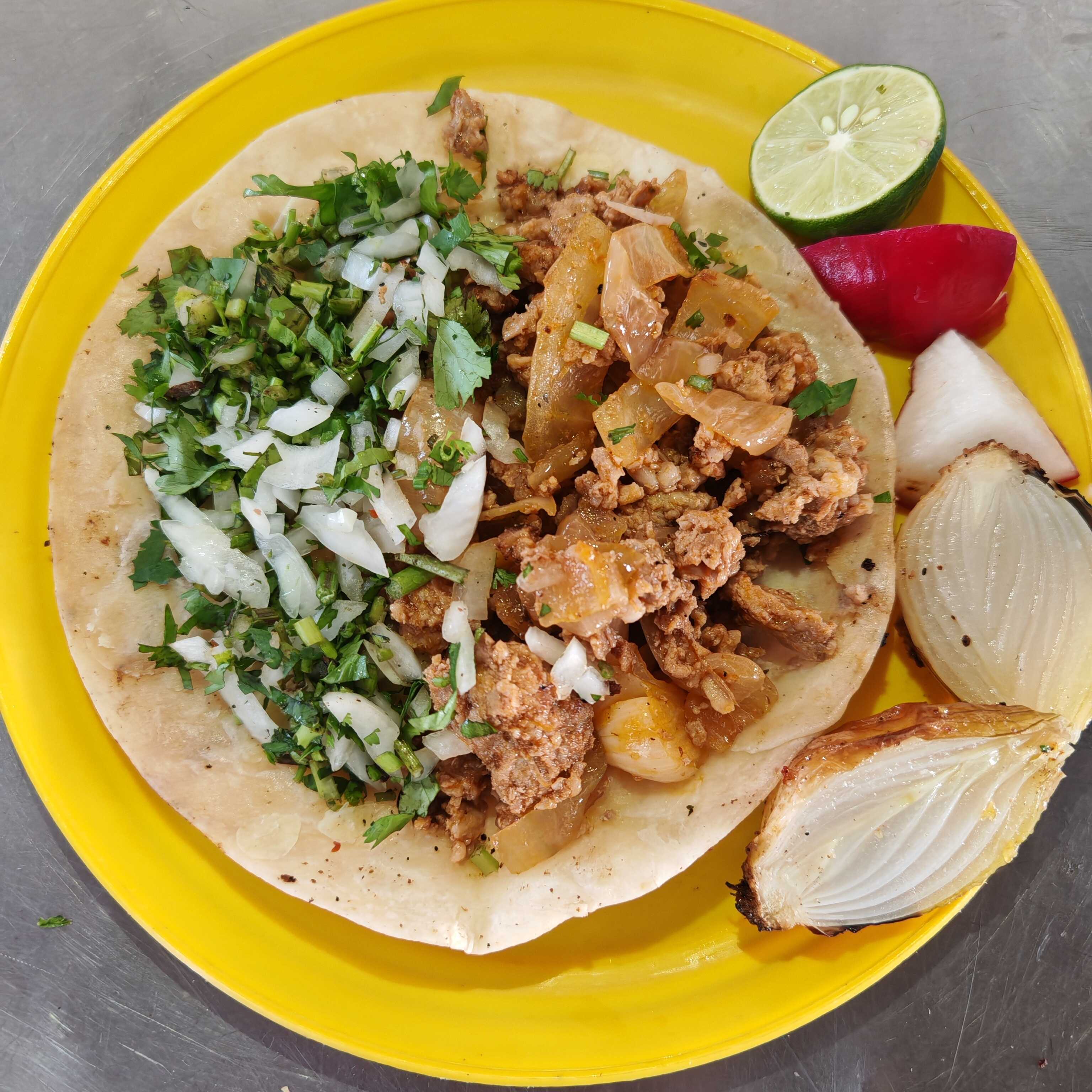 Pastor, cebolla, cilantro, salsa roja