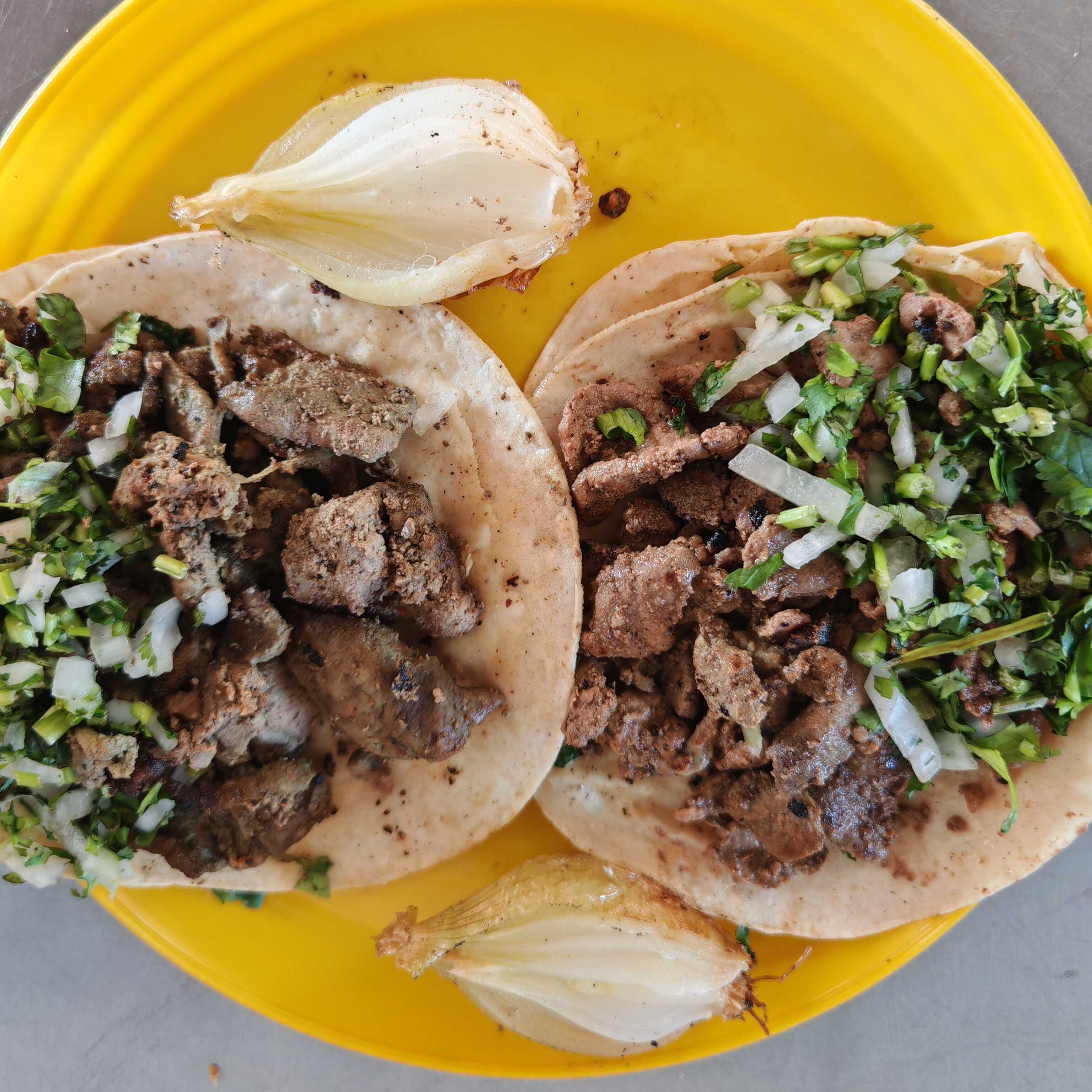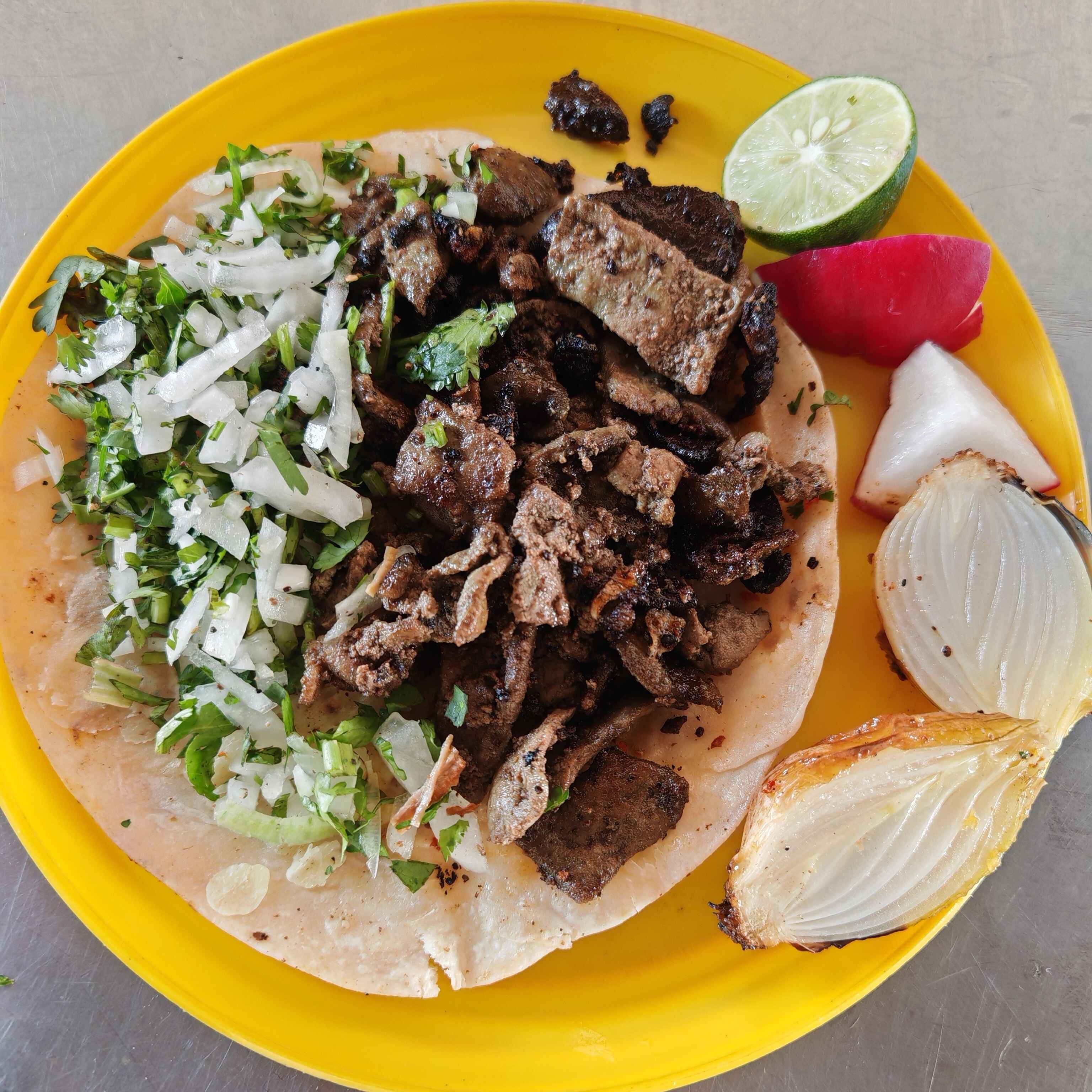 Hígado, cebolla asada, cebolla, cilantro, salsa roja