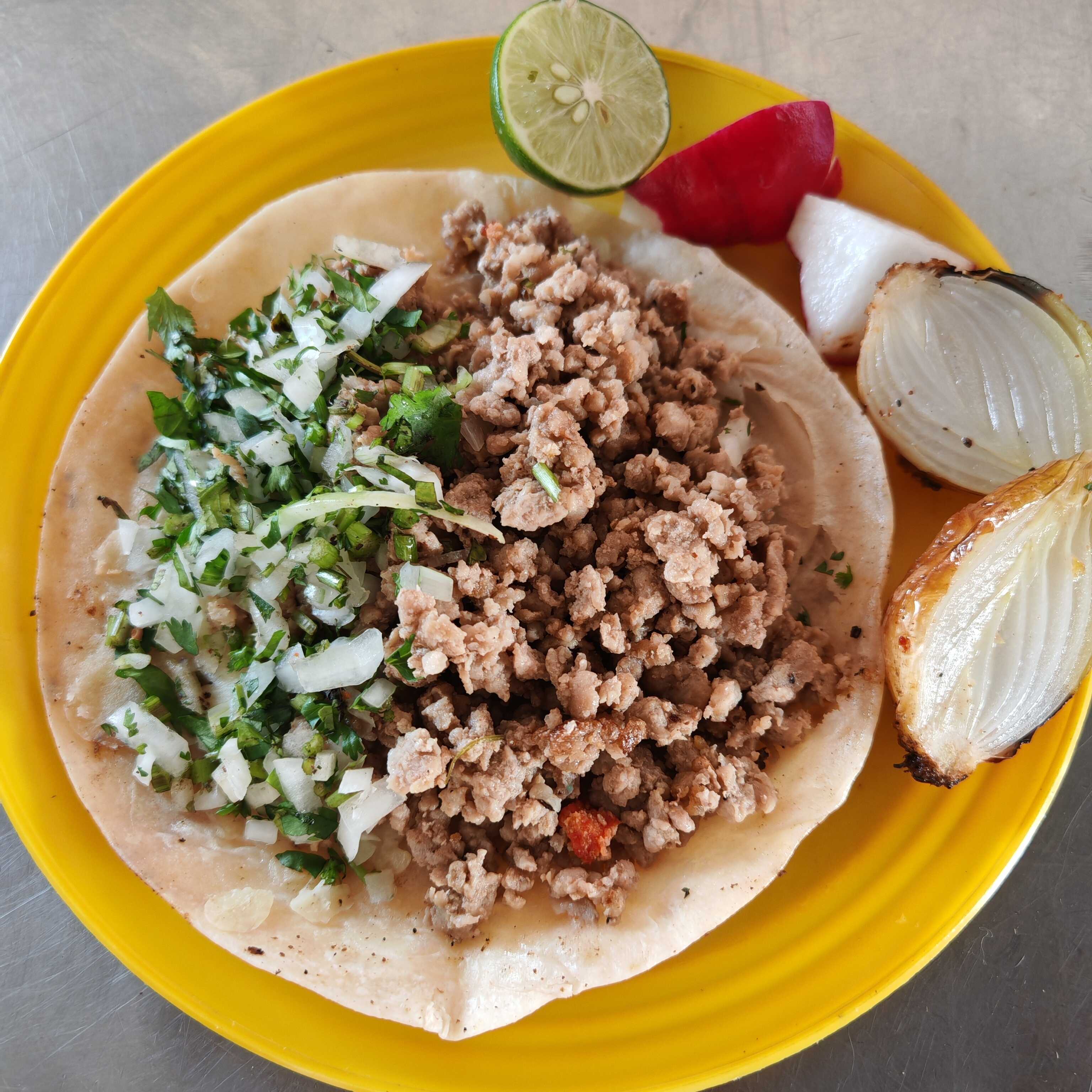 Carne, cebolla, cilantro, salsa roja