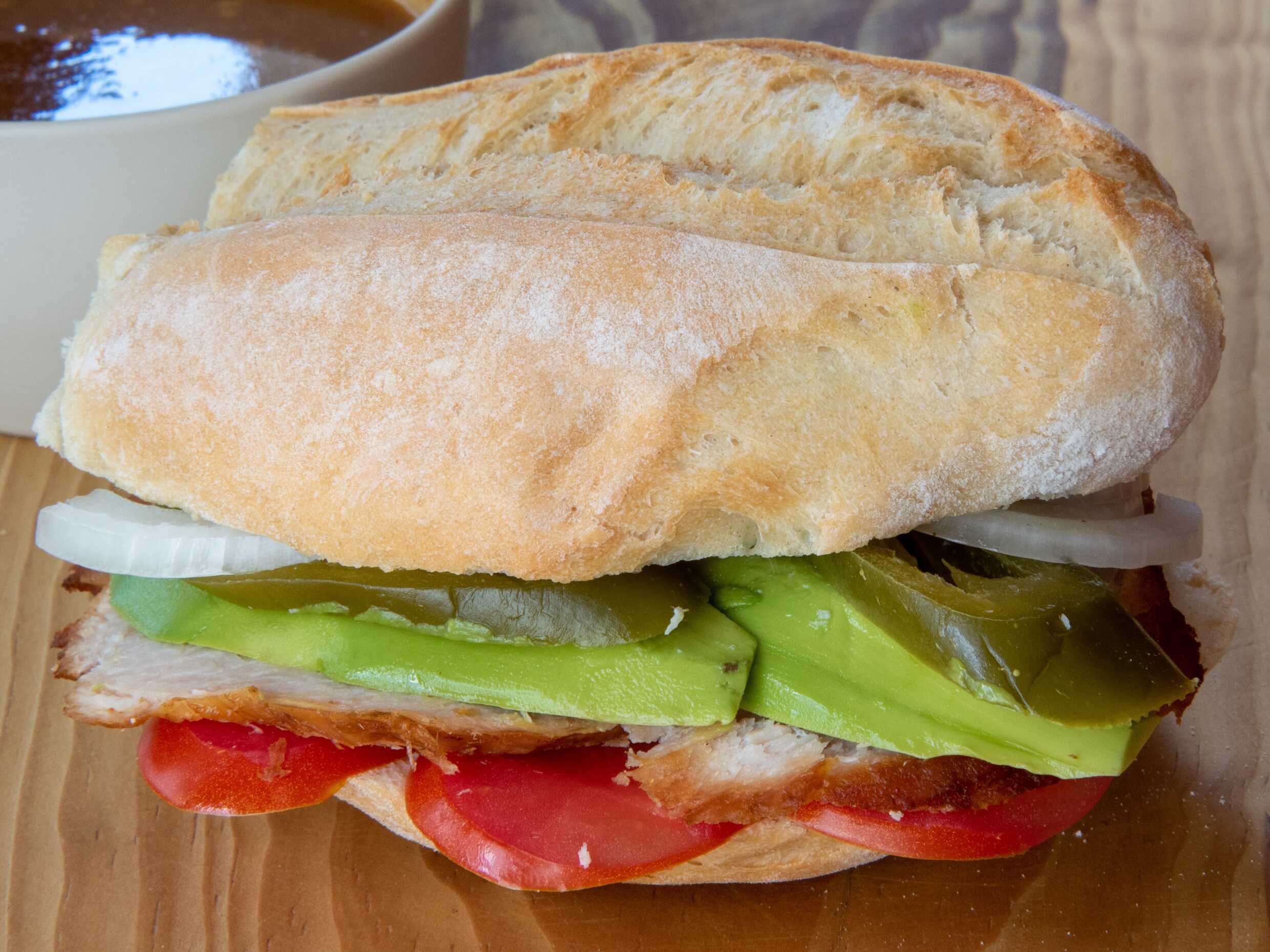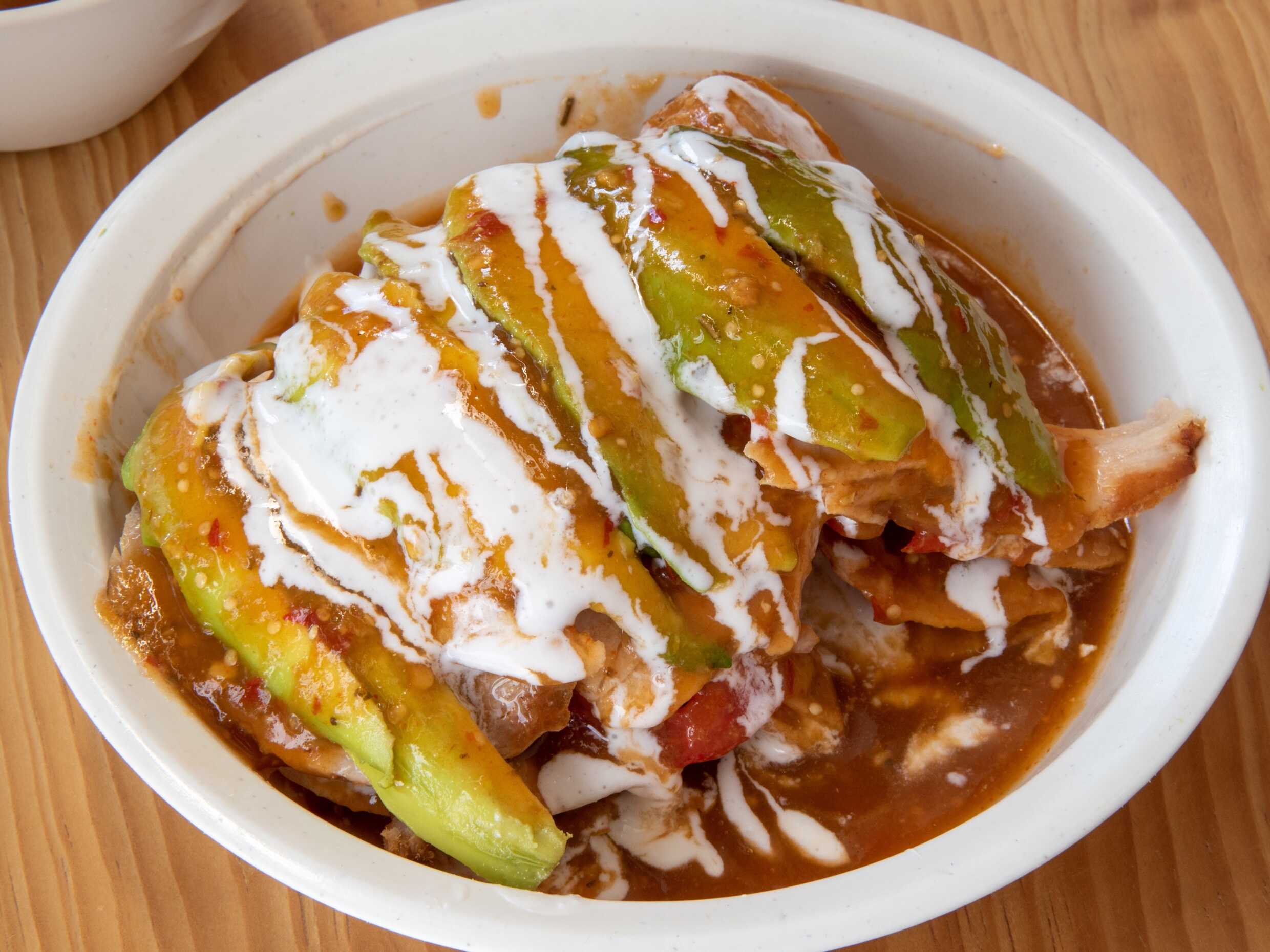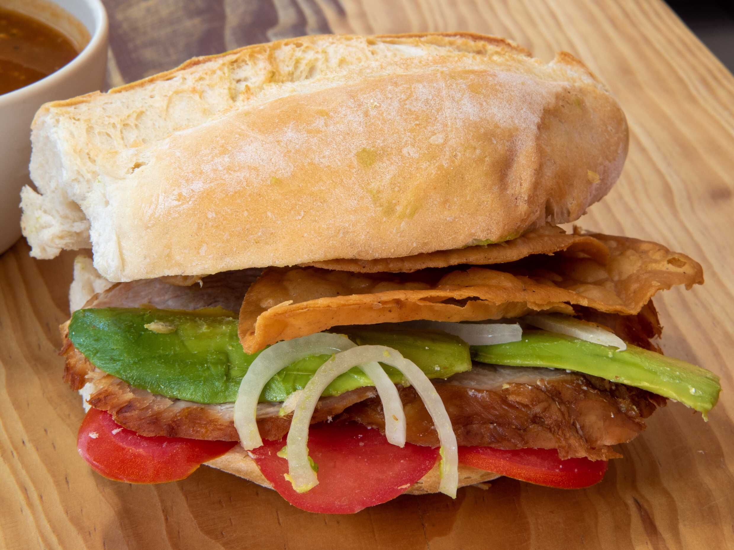 Carnitas, aguacate, crema, jitomate, cebolla, chile jalapeño y mostaza.