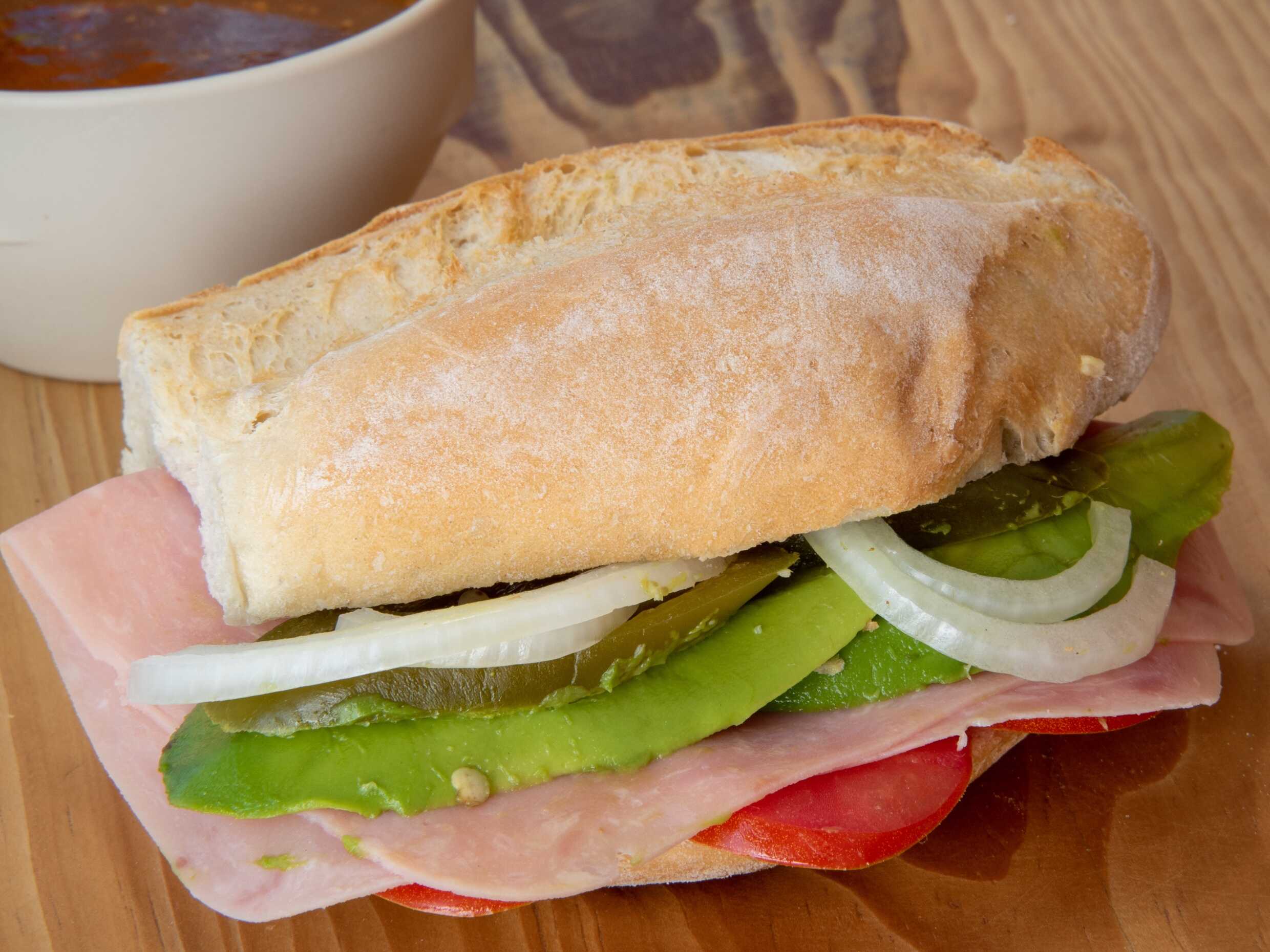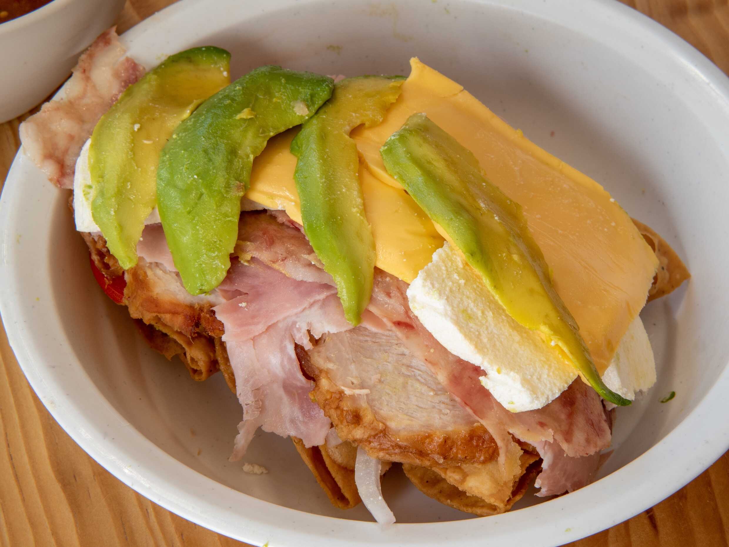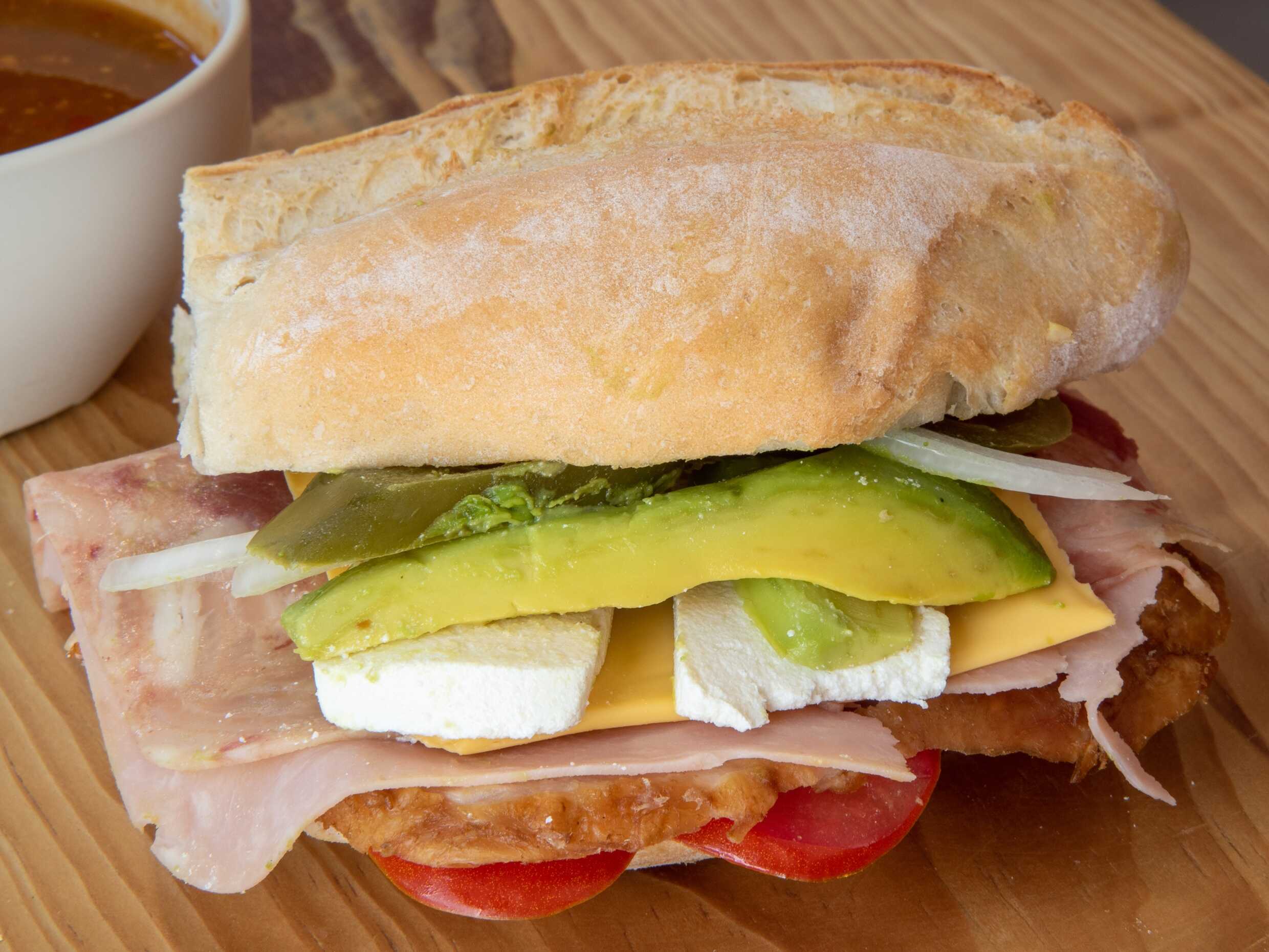 Jamón, queso de puerco, carne, queso amarillo, queso blanco y aguacate.