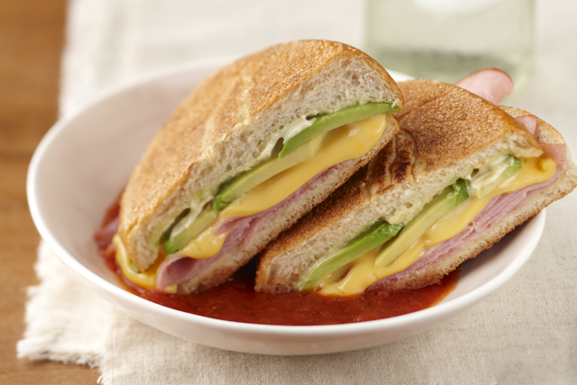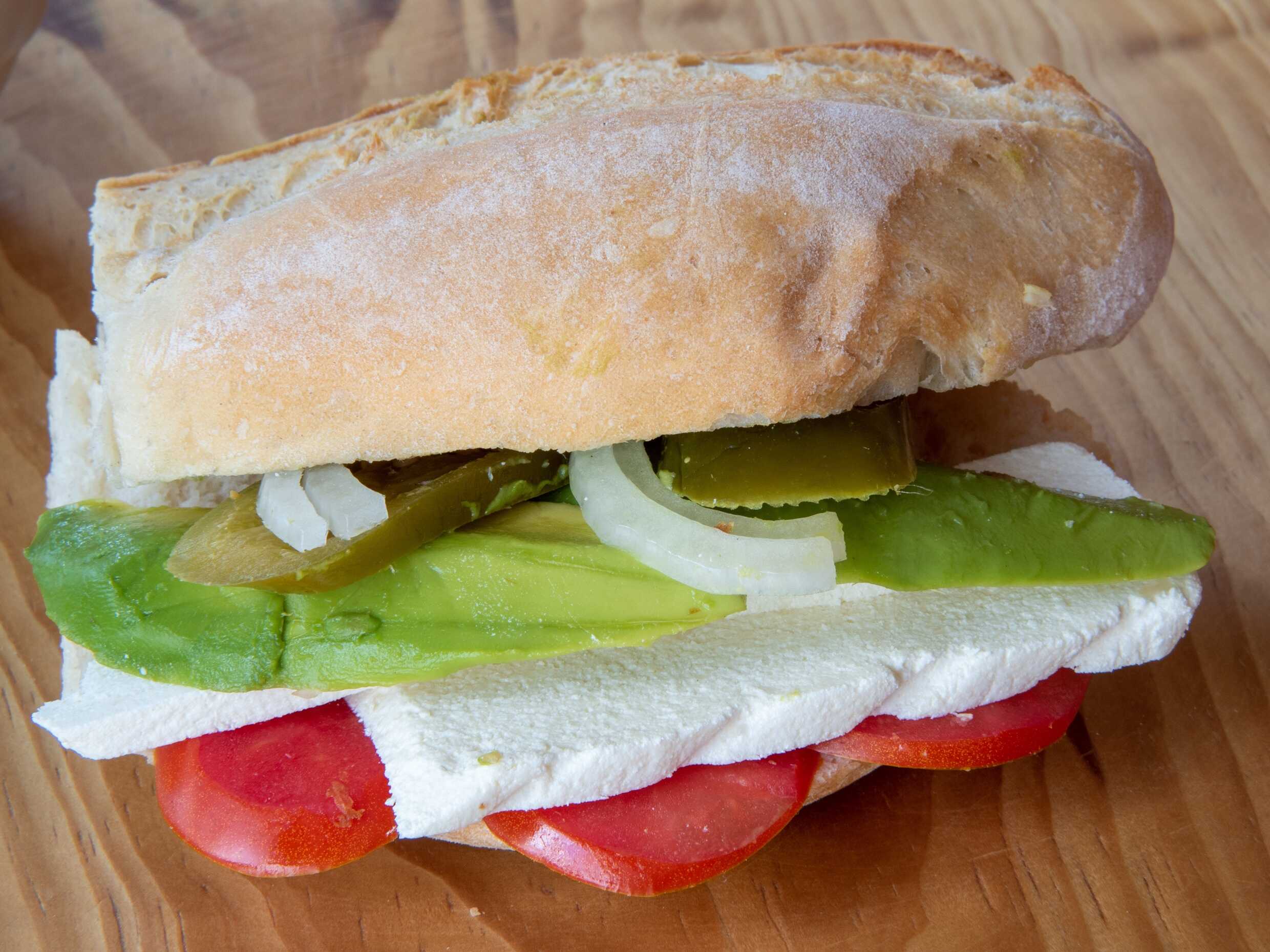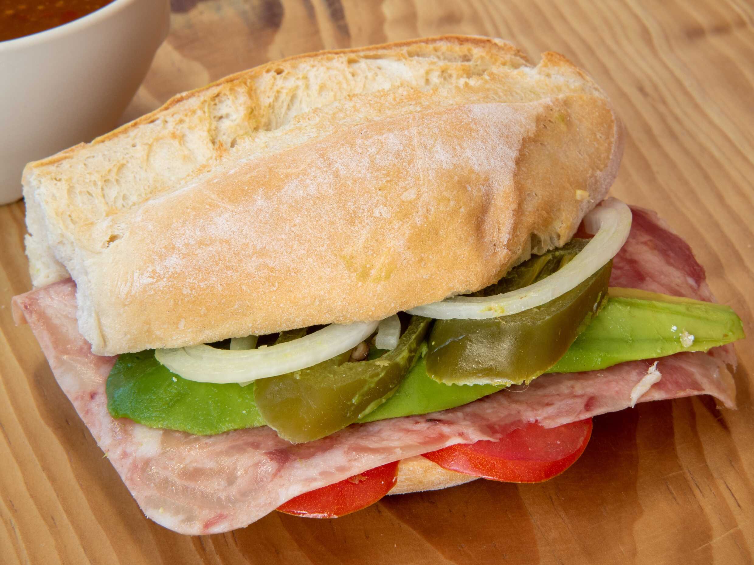Jamón, queso de puerco, carne, queso amarillo, queso blanco y aguacate.