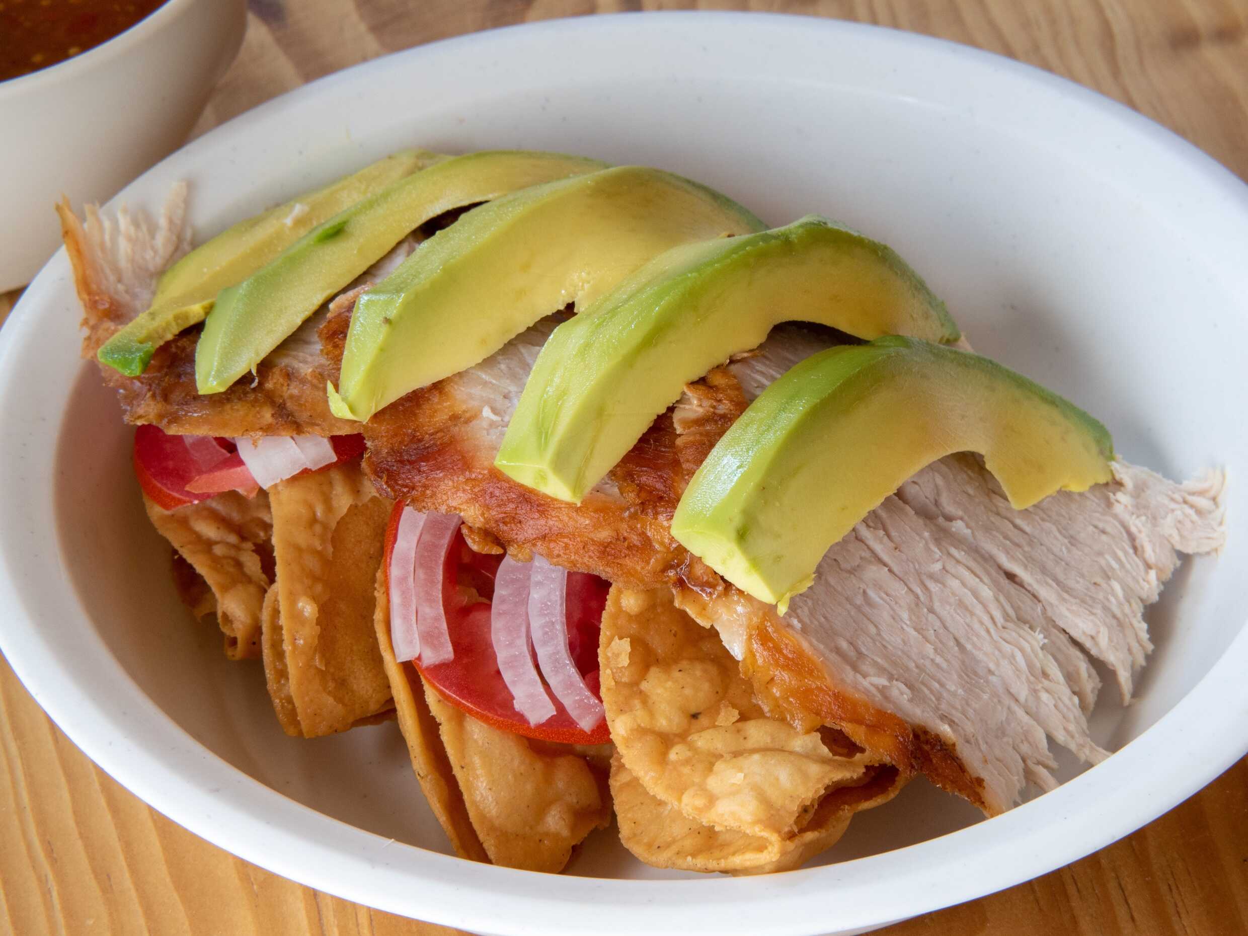 Carnitas aguacate crema jitomate cebolla Chile vinagre mostaza y taco dorado