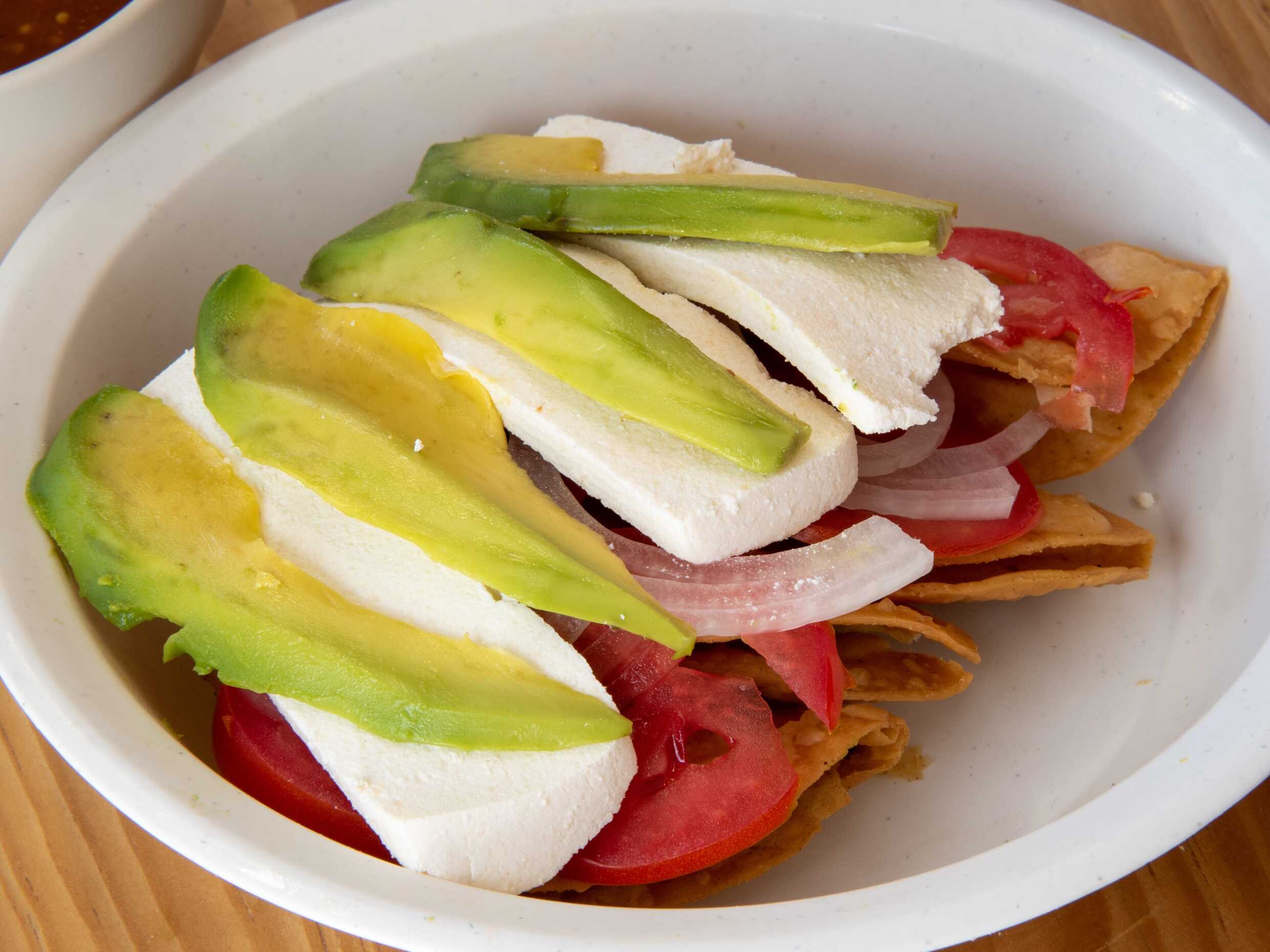 Crema, jitomate, cebolla, salsa y aguacate.