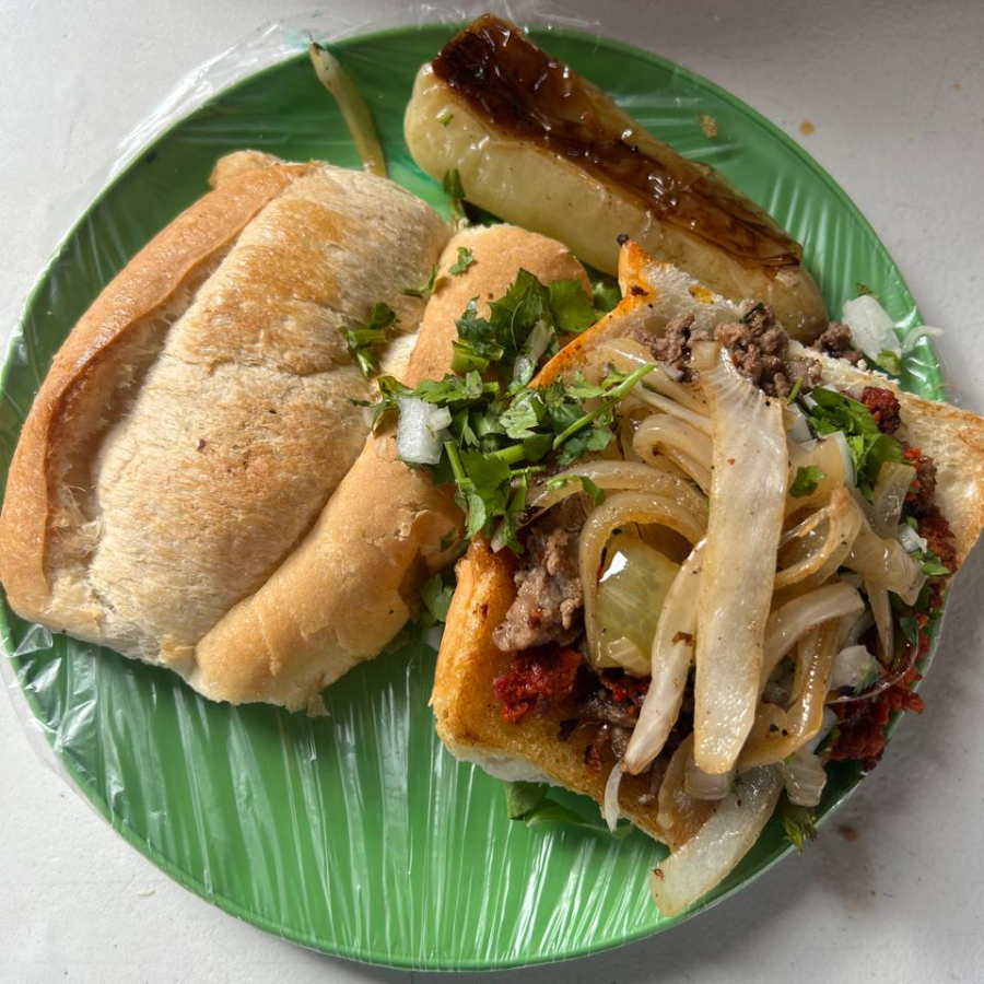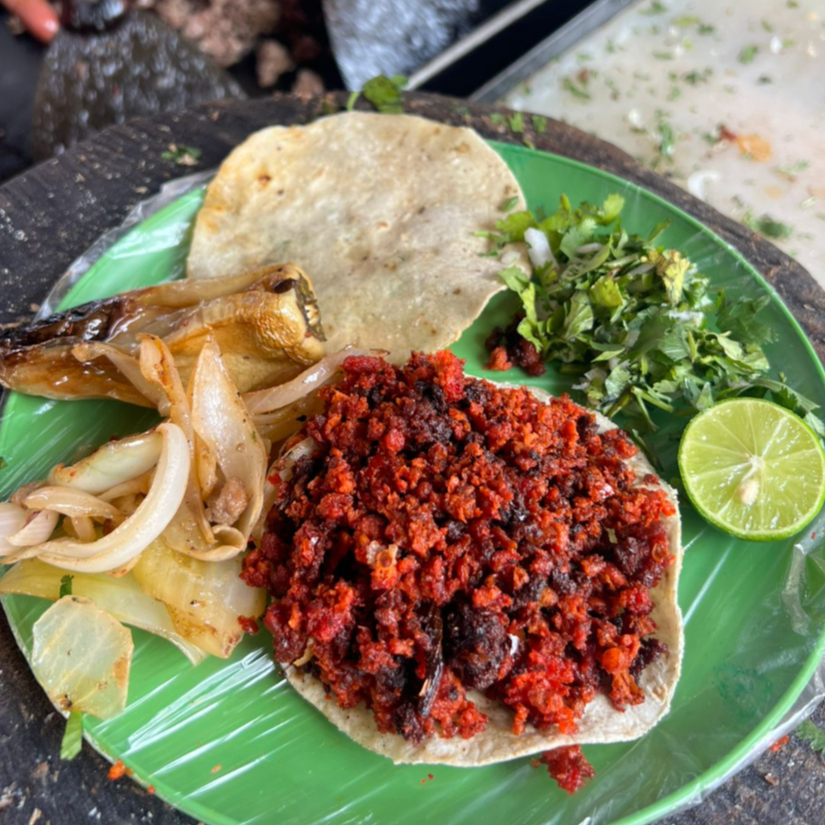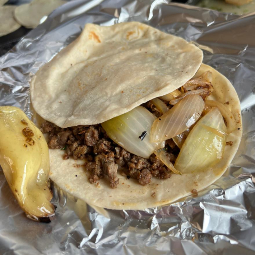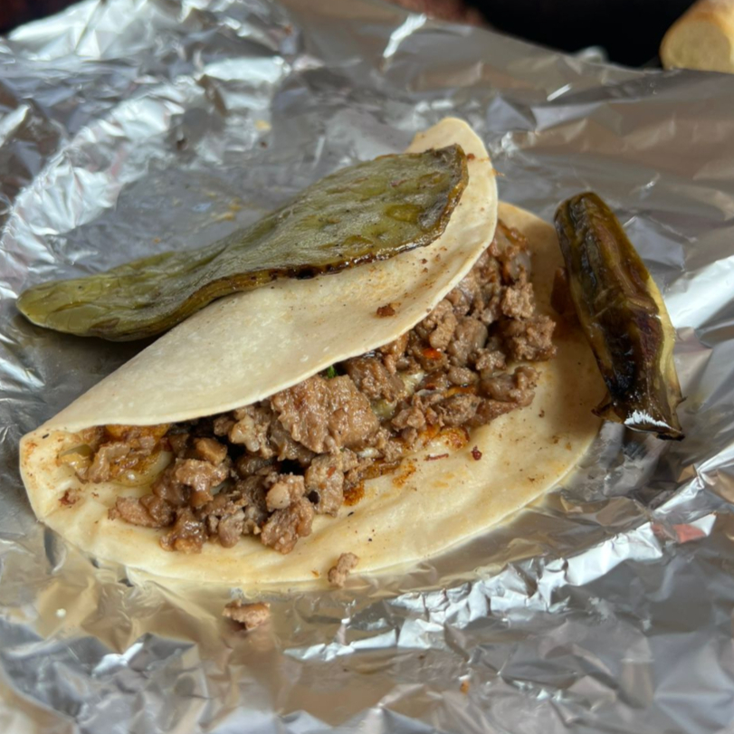 Dos tortillas doradas con queso. INGREDIENTES AL GUSTO (Bistec, Chorizo, Costilla, Pastor, Buche, Hígado y Tripas). Acompañado: Esalada (pepino, jicama, cebolla, chile), Verdura cruda (cilantro y cebolla), Verdura asada (cebolla, chile serrano, nopales y chiles Güeros) y Salsas (roja y verde)