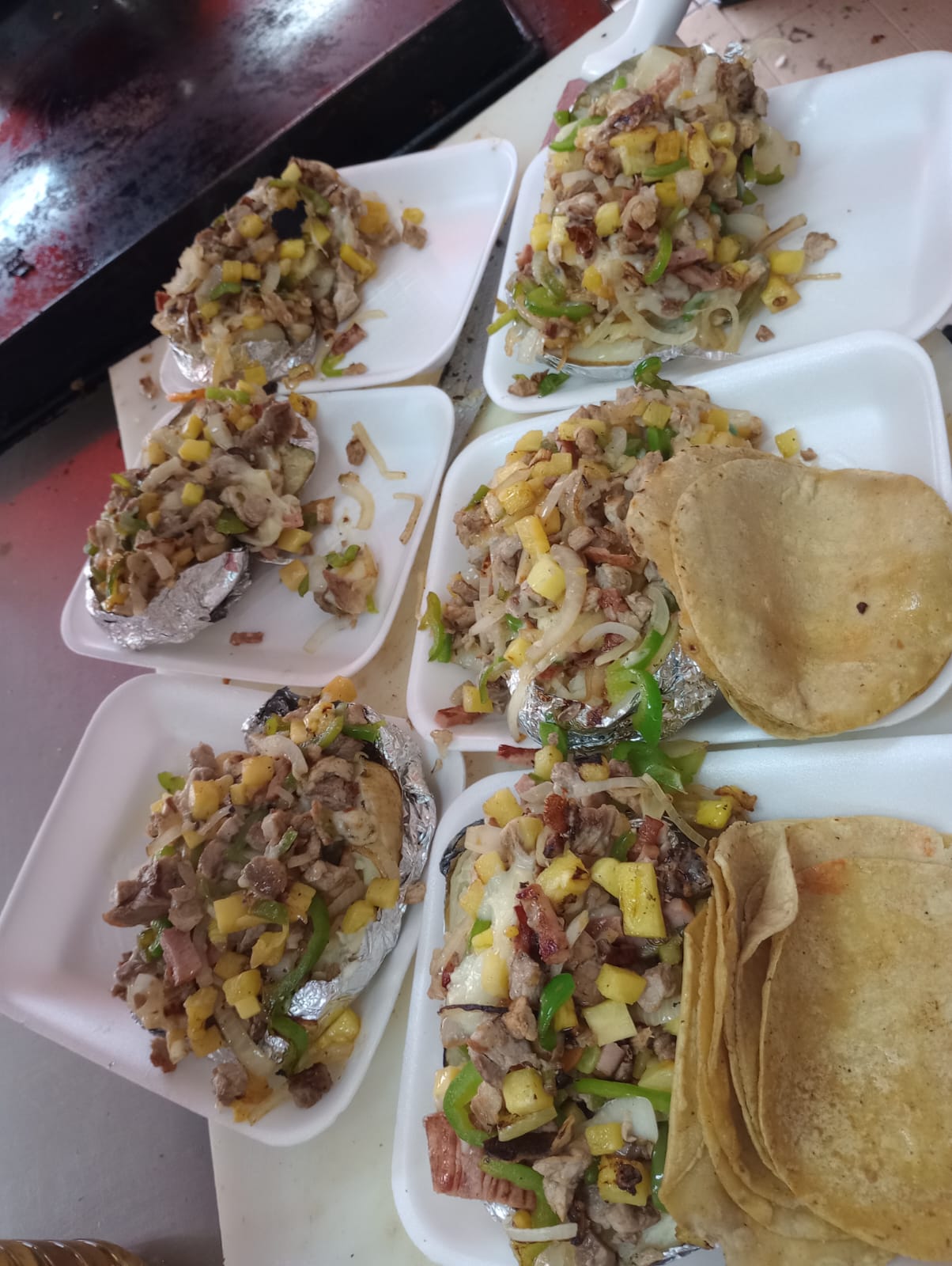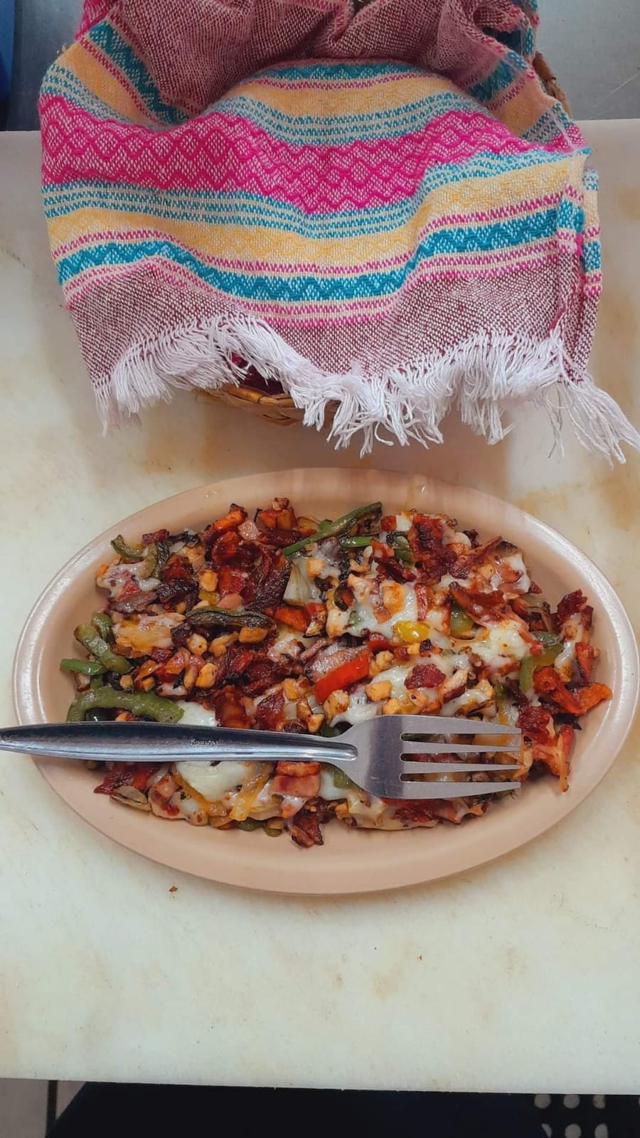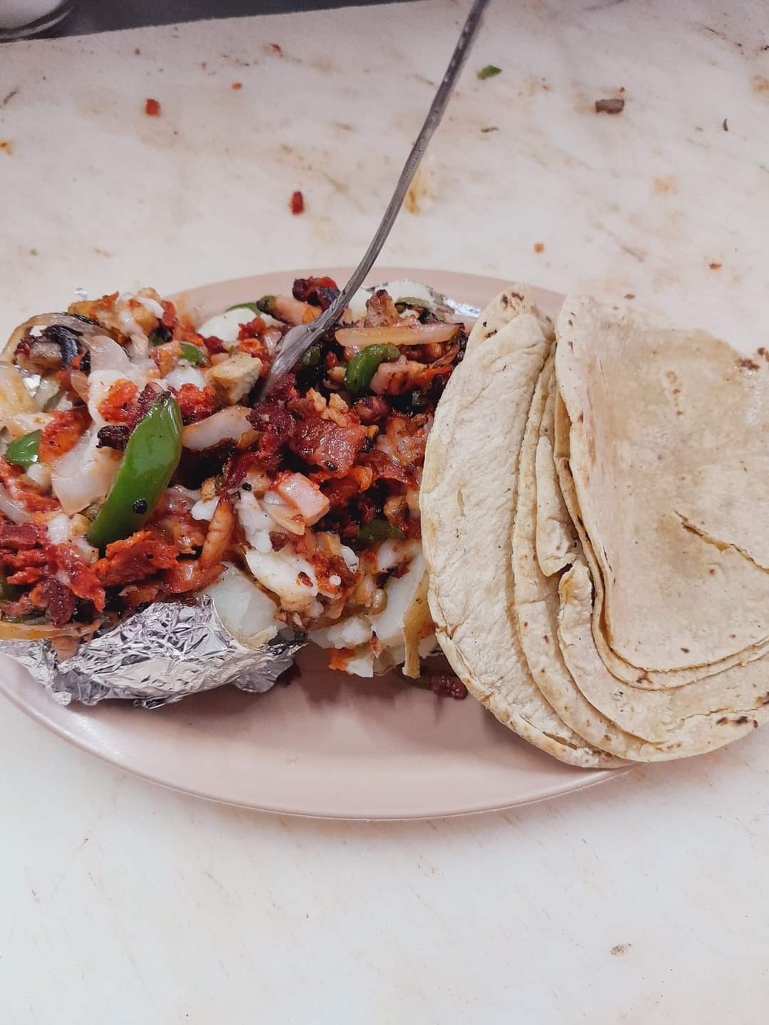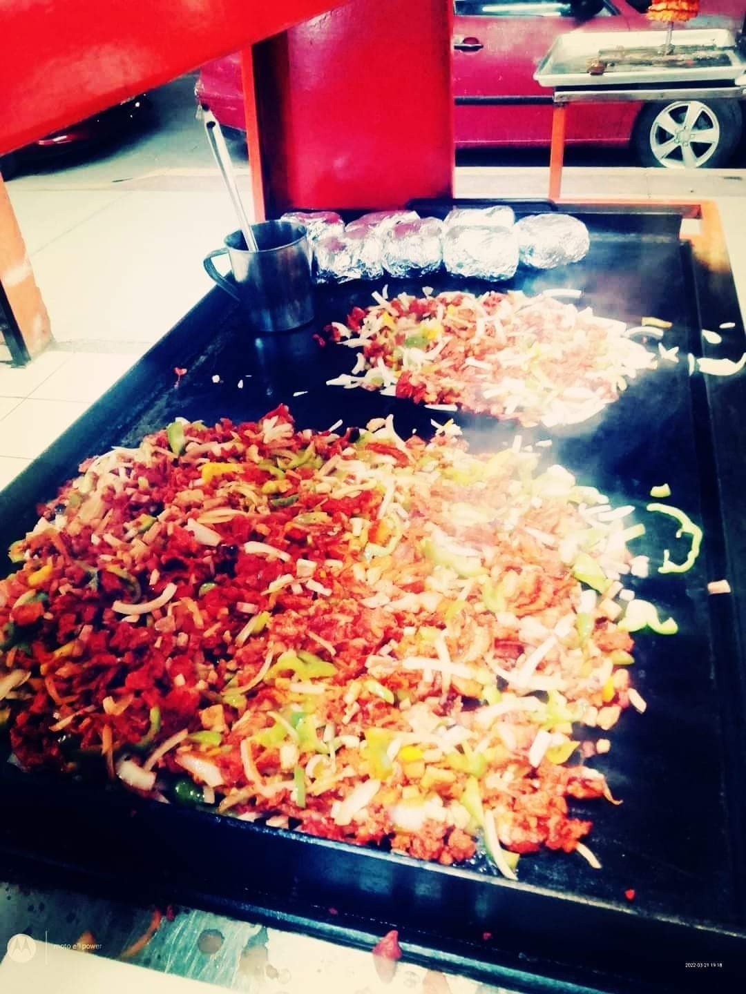 Morrón, cebolla, pastor, chorizo y guarnición.
