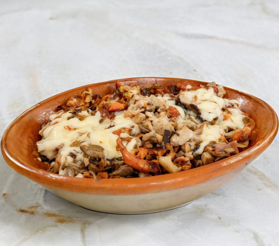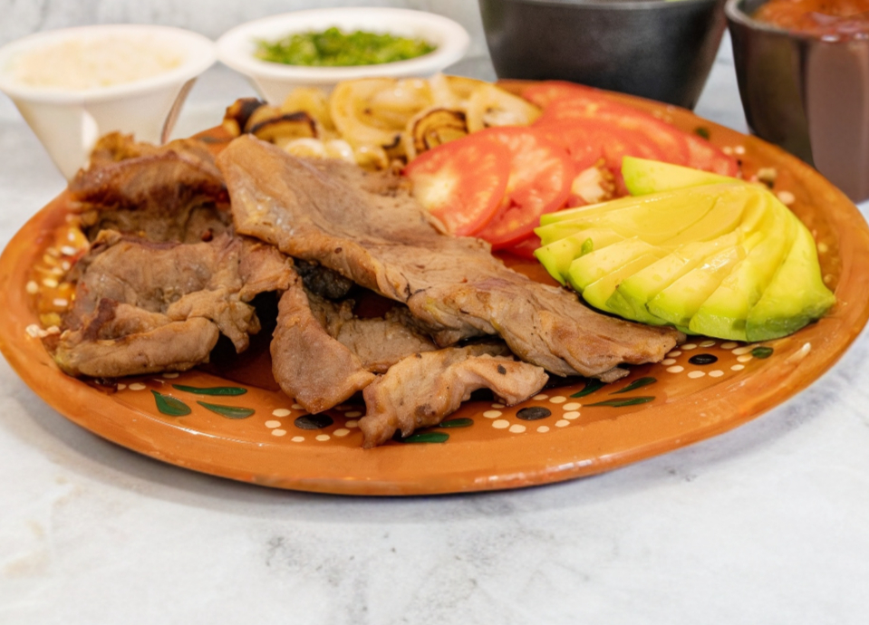 Chorizo, bistec, pastor, chuleta, pollo, tocino, champiñones, morón, cebolla y queso.