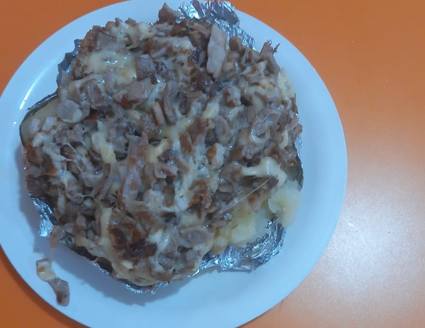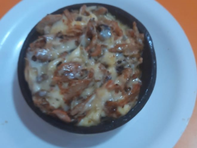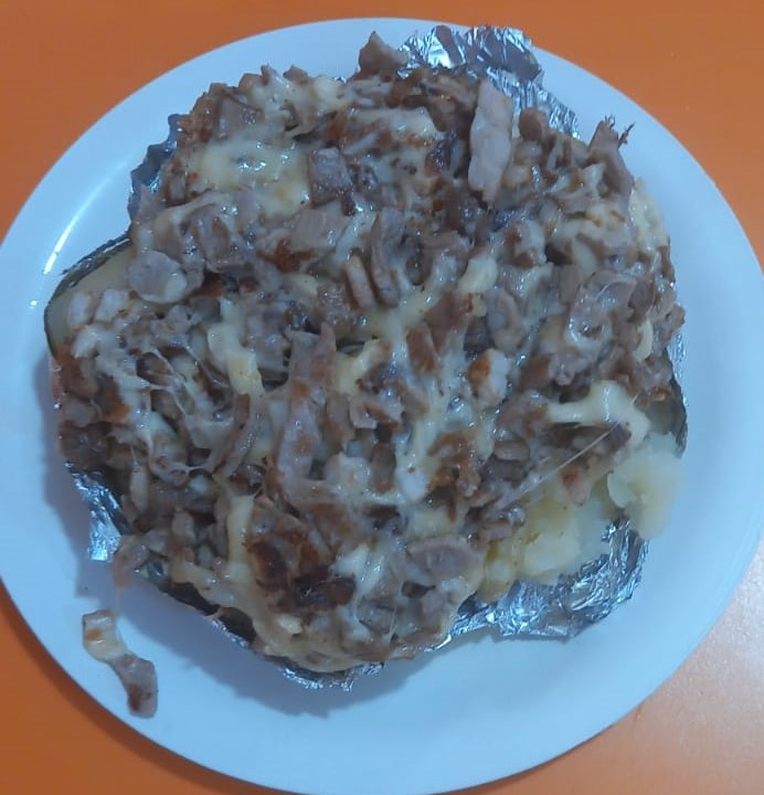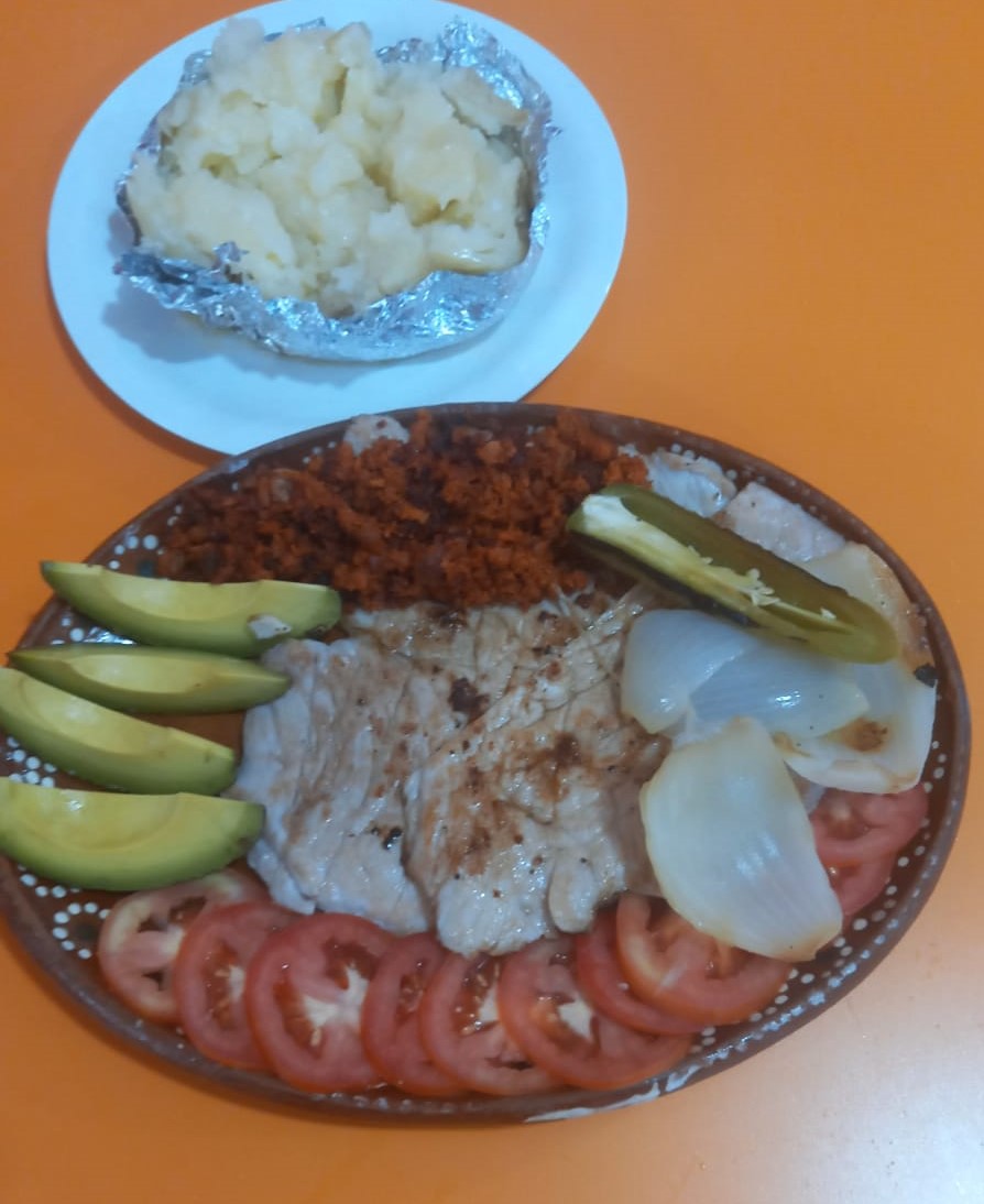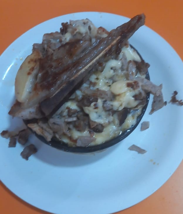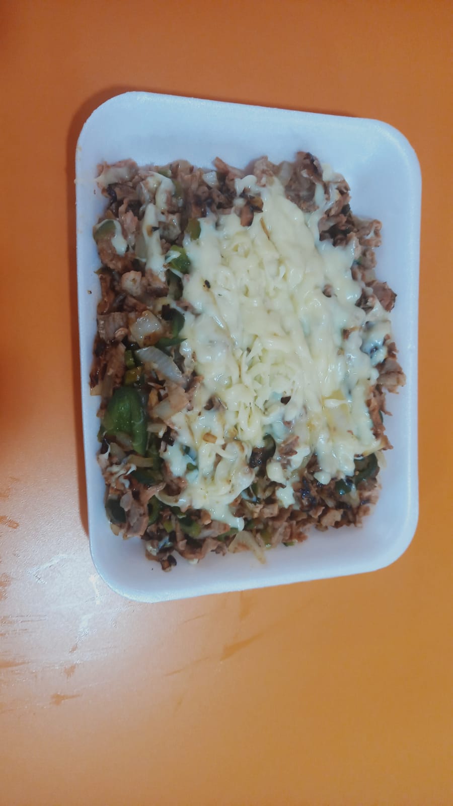 Bistec, tocino, cebolla, chile poblano y queso asadero.