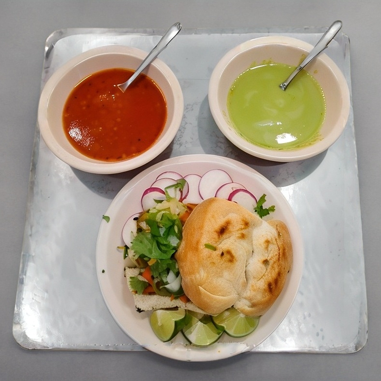 Acompañado de salsa roja, guacamole, ensalada, verdura aparte y cebollas asadas.