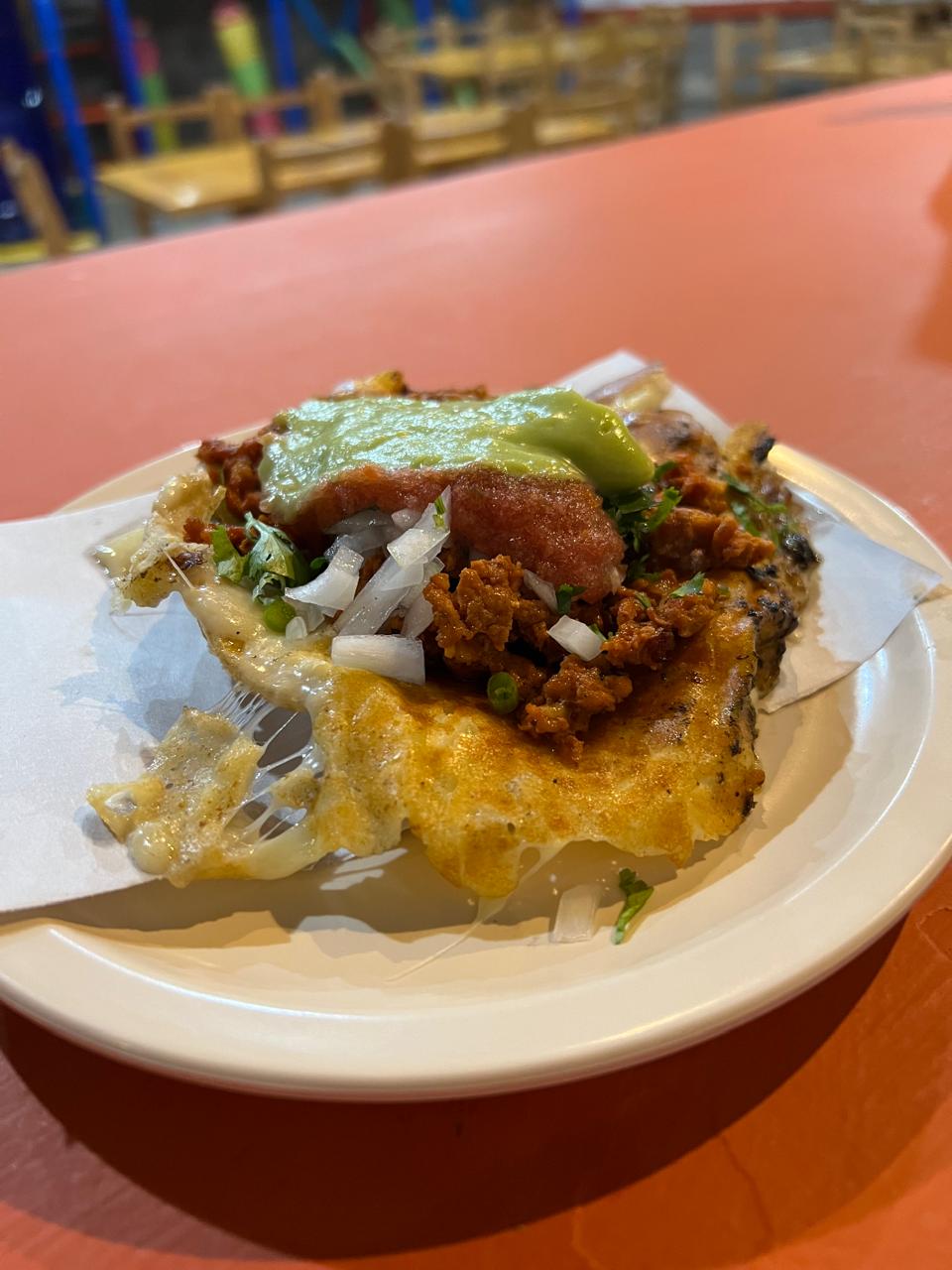 Tostada de maíz con una costra de queso, carne a elegir (90 gr.), acompañada con cebolla, cilantro, salsa y guacamole.