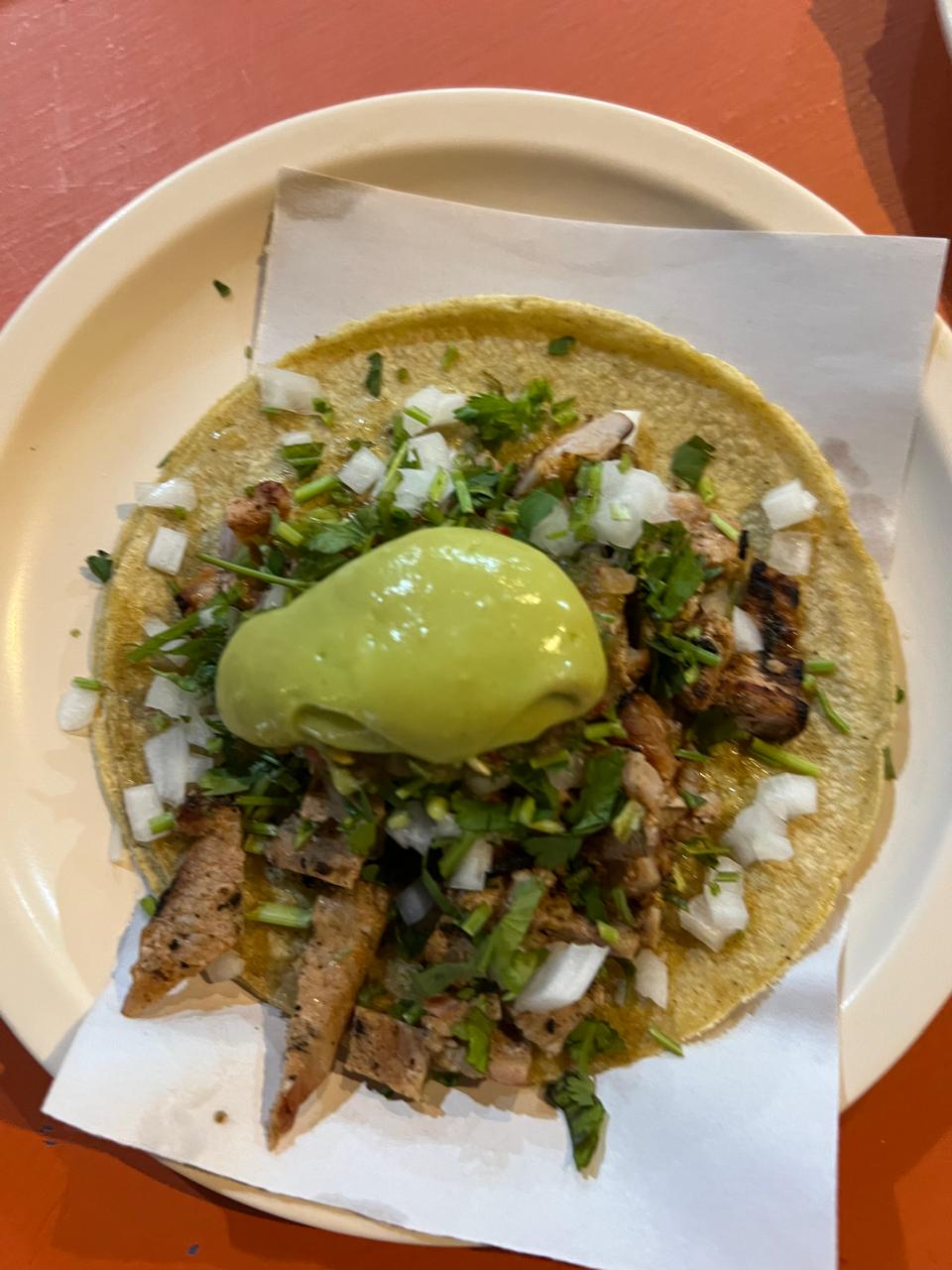 Tostada de maíz con carne a elegir (90 gr.) acompañada de cebolla, cilantro, salsa y guacamole. Una sola pieza