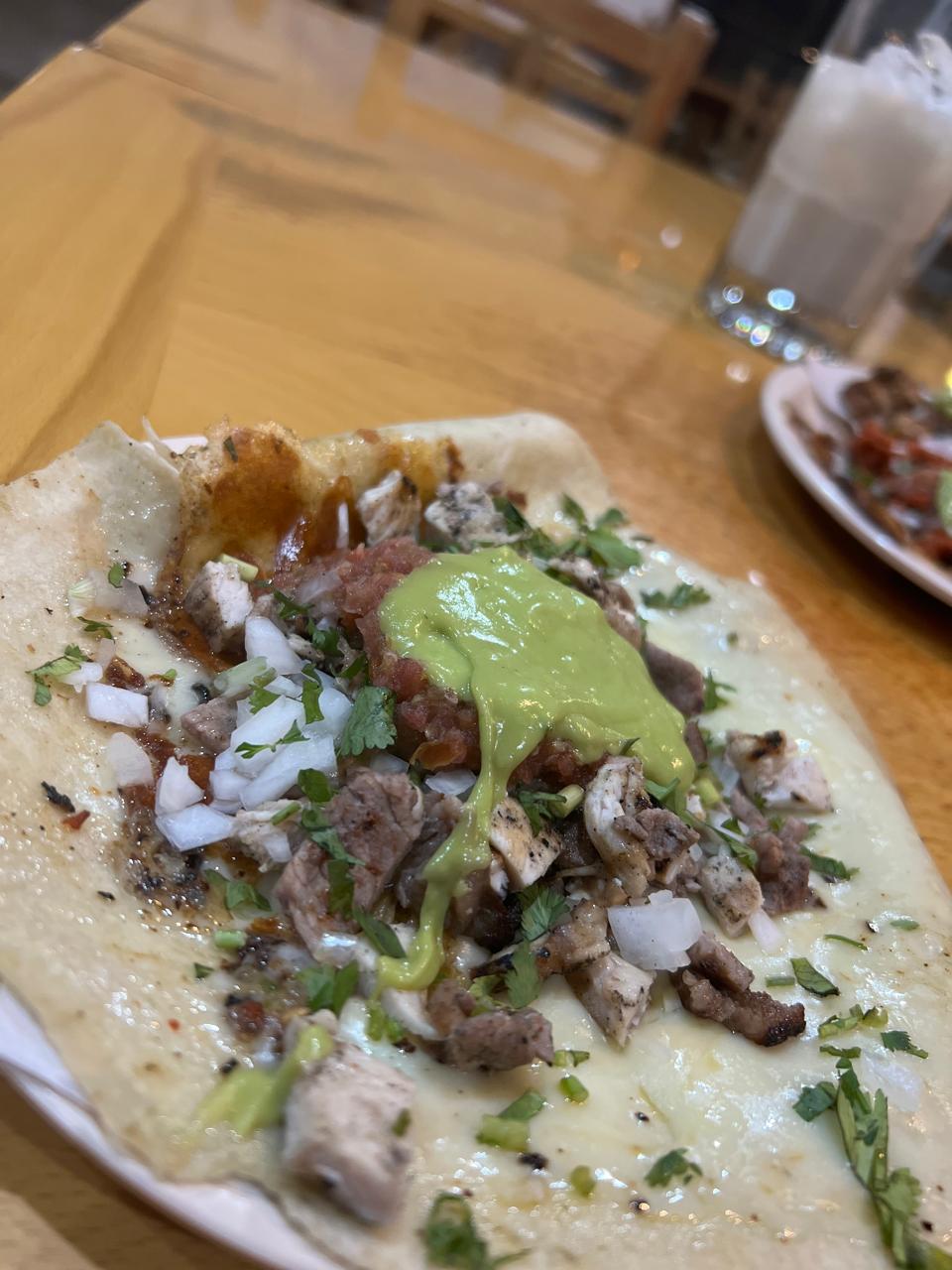 2 tortillas de harina con costra de queso en medio, carne a elegir (90 gr.) acompañada de cebolla, cilantro, salsa y guacamole.